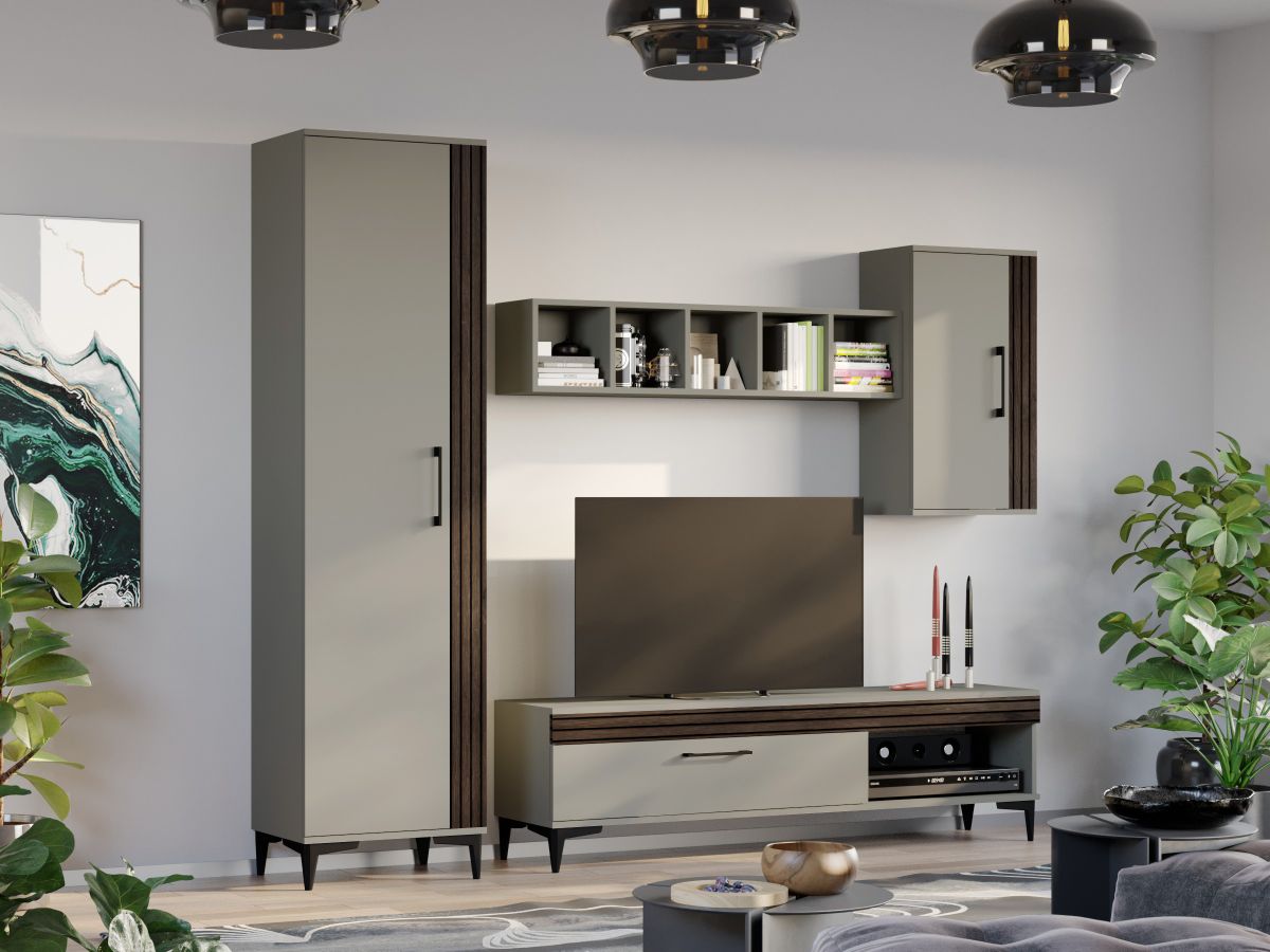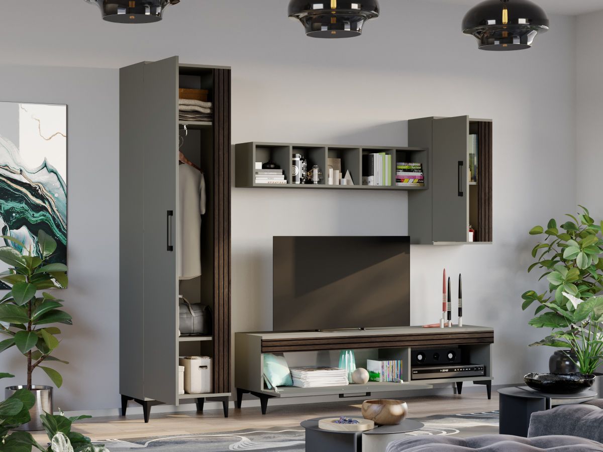 Living Nori C13 – Mobila sufragerie Living Nori C13 – Mobila sufragerie face parte din familia de mobila pentru sufragerie / living Nori . Aceasta colectie este alcatuita din mai multe module, care, prin combinatiile de materiale si culori, denota o eleganta si un rafinament aparte. Puteti alege direct din configuratiile realizate de noi sau, daca doriti, puteti creea singuri propria configuratie de living combinand corpurile de mobila astfel incat sa se potriveasca perfect in spatiul dorit. Livrare gratuita si rapida, 4-10 zile lucratoare prin flota proprie Suntem producatori de mobilier, fara intermediari Toate piesele de mobilier au o garantie de 2 ani Living Nori C13 – Mobila sufragerie Corpurile din gama Living Nori sunt construite din PAL melaminat de 16mm cu finisaj Casmir si Deep Line (cu aspect care imita riflajul) care, impreuna cu manerele si picioarele negre , creeaza un ambient primitor si o atmosfera placuta. Cantul aplicat este unul de 0,6 care le permite muchiilor sa fie placute la atingere. Atentie! Elementele de prindere de tipul dibluri, surub sau horsurub nu sunt incluse deoarce tipul de prindere difera in functie de tipul peretelui pe care urmeaza a se monta mobilierul (beton, caramida, BCA, rigips, lemn etc). Video de prezentare familie Videoclipul de prezentare poate contine mai putine sau mai multe corpuri de mobilier in comparatie cu produsul de pe aceasta pagina. Scopul acestui video este de a detalia aspectul materialelor, accesoriilor cat si a familiei din care face parte. Dimensiuni Living Nori C13 Imaginea alaturata prezinta compartimentarea pentru Living Nori C13 – Mobila sufragerie . Aceasta configuratie are 4 corpuri modulare , 2 suspendate si 2 pe sol. Spatii de depozitare cu usa cat si etajere si polite. Dulapul are o bara de haine. Dimensiuni corpuri componente: Dulap Haine: L 51.6 x A 35.1 x H 192.4 cm – Schita Montaj Comoda TV 1600: L 160 x A 33.5 x H 43.7 cm – Schita Montaj Corp Superior: L 43.9 x A 26.6 x H 77 cm – Schita Montaj Corp Decorativ cu Polite: L 120 x A 22 x H 25 cm – Schita Montaj Inaltime picioare 12cm, este inclusa in dimensiunile corpurilor si dimensiunea totala. Dimensiuni totale livin L 230 x A 35.1 x H 192.4 cm (inaltimea poate varia in functie de inaltimea pentru care optati atunci cand suspendati corpurile superioare) Spatiul de TV: diagonala recomandata maxima 180cm/70″ Toate corpurile se pot pune pe stanga sau pe dreapta in functie de cum doriti. Nu este obligatoriu pozitionarea ca in prezentare. Ele nu sunt prinse unul de celalalt. Pretul afisat nu include alte accesorii sau obiecte de decor (TV, tablouri, elemente de iluminat, covor etc.) Dimensiunile sunt exprimate in cm si pot oscila intre ± 10 mm. Living Nori C13 – Mobila sufragerie se livreaza demontat si este insotit de accesorii si instructiuni de asamblare.