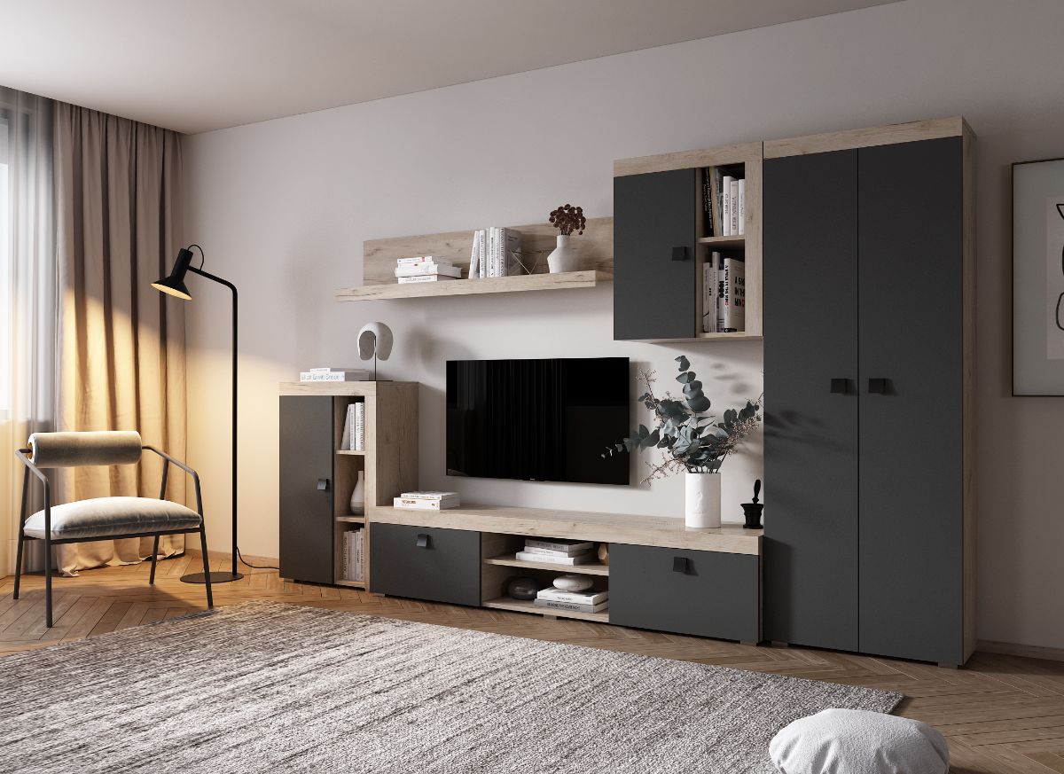 Living Ontario C1 UNO – Mobila sufragerie Living Ontario C1 UNO – Mobila sufragerie are un aspect contemporan / modern si este alcatuita din mai module. Puteti alege direct din configuratiile realizate de noi sau daca doriti puteti creea singuri propria configuratie de living combinand din corpurile de mobila pentru living. In functie de spatiul unde doriti sa amplasati mobila puteti adapta livingul. Livrare gratuita si rapida, 4-10 zile lucratoare prin flota proprie Suntem producatori de mobilier, fara intermediari Toate piesele de mobilier au o garantie de 2 ani Corpurile sunt construite din PAL melaminat de 16mm cu finisaj gri antracit si stejar k02 , cel din urma avand o textura similara lemnului, care creeaza un contrast rafinat si un ambient placut. Cantul aplicat este unul de 0,6 care le permite muchiilor sa fie placute la atingere . Dimensiuni Living Ontario C1 UNO – Mobila sufragerie Imaginea alaturata prezinta compartimentarea pentru mobila de sufragerie Ontario. Aceasta configuratie are 5 corpuri modulare , 2 suspendate si 3 pe sol. Spatii de depozitare cu usa cat si etajere si polita. Dulapul are 2 spatii de depozitare si o bara pentru haine. Poate fi folosit si pentru haine cat si pentru obiecte diverse. Dimensiuni corpuri: Comoda TV: L 180 x A 35.2 x H 39.8 cm Comoda Inalta: L 60 x A 30.4 x H 96.8 cm Dulap 2 usi: L 67.6 x A 30.4 x H 182 cm Corp Suspendat: L 60 x A 30.4 x H 69.8 cm Polita 1390 : L 139 x A 21.6 x H 34.8 cm Dimensiuni totale livin L 307.6 x A 35.2 x H 182 cm Spatiul de TV: diagonala max 126cm/50″ (sau mai mare) Recomandam un TV cu o diagonala de maxim 126cm/50″. Se pot utiliza si diagonale mai mari mutand corpul suspendat mai in stanga. Toate corpurile se pot pune pe stanga sau pe dreapta in functie de cum doriti. Nu este obligatoriu pozitionarea ca in prezentare. Ele nu sunt prinse unul de celalalt. Info si schite montaj mobila sufragerie DESCARCA SCHITA MONTAJ COMODA TV DESCARCA SCHITA MONTAJ COMODA INALTA DESCARCA SCHITA MONTAJ CORP SUSPENADAT DESCARCA SCHITA MONTAJ POLITA DESCARCA SCHITA MONTAJ DULAP Atentie! Elementele de prindere de tipul dibluri, surub sau horsurub nu sunt incluse deoarce tipul de prindere difera in functie de tipul peretelui pe care urmeaza a se monta mobilierul (beton, caramida, BCA, rigips, lemn etc). Pretul afisat nu include alte accesorii sau obiecte de decor (TV, tablouri, elemente de iluminat, covor etc.) Dimensiunile sunt exprimate in cm si pot oscila intre ± 10 mm. Produsul se livreaza demontat si este insotit de accesorii si instructiuni de asamblare.