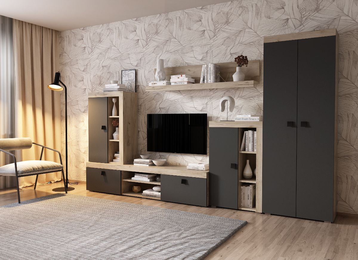Living Ontario C2 UNO- Mobila sufragerie Living Ontario C2 UNO- Mobila sufragerie are un aspect contemporan / modern si este alcatuita din mai module. Puteti alege direct din configuratiile realizate de noi sau daca doriti puteti creea singuri propria configuratie de living combinand din corpurile de mobila pentru living. In functie de spatiul unde doriti sa amplasati mobila puteti adapta livingul. Livrare gratuita si rapida, 4-10 zile lucratoare prin flota proprie Suntem producatori de mobilier, fara intermediari Toate piesele de mobilier au o garantie de 2 ani Corpurile sunt construite din PAL melaminat de 16mm cu finisaj gri antracit si stejar k02 , cel din urma avand o textura similara lemnului, care creeaza un contrast rafinat si un ambient placut. Cantul aplicat este unul de 0,6 care le permite muchiilor sa fie placute la atingere . Dimensiuni Living Ontario C2 UNO- Mobila sufragerie Imaginea alaturata prezinta compartimentarea pentru mobila de sufragerie Ontario. Aceasta configuratie are 5 corpuri modulare , 1 suspendat si 4 pe sol. Spatii de depozitare cu usa cat si etajere si polita. Dulapul are 2 spatii de depozitare si o bara pentru haine. Poate fi folosit si pentru haine cat si pentru obiecte diverse. Dimensiuni corpuri: Comoda TV: L 180 x A 35.2 x H 39.8 cm Comoda Inalta x 2 buc: L 60 x A 30.4 x H 96. 8 cm Dulap 2 usi: L 67.6 x A 30.4 x H 182 cm Polita 1390 : L 139 x A 21.6 x H 34.8 cm Dimensiuni totale livin L 307.6 x A 35.2 x H 182 cm Spatiul de TV: diagonala max 126cm/50″ (sau mai mare) Recomandam un TV cu o diagonala de maxim 126cm/50″. Se pot utiliza si diagonale mai mari mutand corpurile in alte pozitii. Toate corpurile se pot pune pe stanga sau pe dreapta in functie de cum doriti. Nu este obligatoriu pozitionarea ca in prezentare. Ele nu sunt prinse unul de celalalt. Info si schite montaj mobila sufragerie DESCARCA SCHITA MONTAJ COMODA TV DESCARCA SCHITA MONTAJ COMODA INALTA DESCARCA SCHITA MONTAJ POLITA DESCARCA SCHITA MONTAJ DULAP Atentie! Elementele de prindere de tipul dibluri, surub sau horsurub nu sunt incluse deoarce tipul de prindere difera in functie de tipul peretelui pe care urmeaza a se monta mobilierul (beton, caramida, BCA, rigips, lemn etc). Pretul afisat nu include alte accesorii sau obiecte de decor (TV, tablouri, elemente de iluminat, covor etc.) Dimensiunile sunt exprimate in cm si pot oscila intre ± 10 mm. Produsul se livreaza demontat si este insotit de accesorii si instructiuni de asamblare.