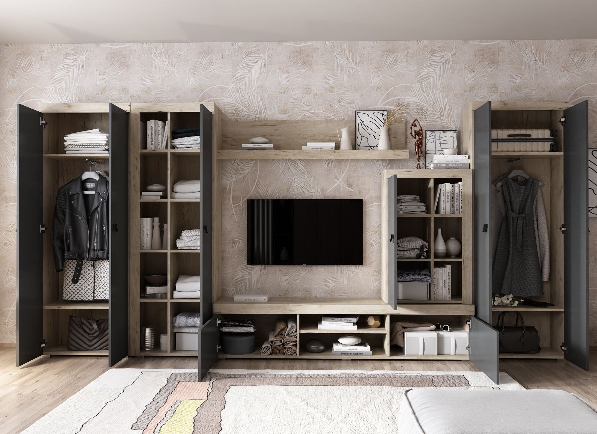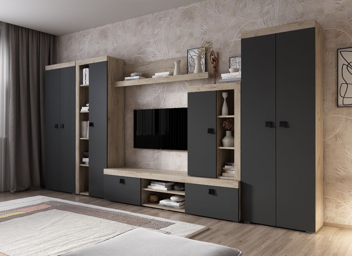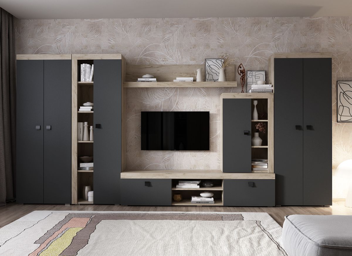 Living Ontario C4 DUO – Mobila sufragerie Living Ontario C4 DUO – Mobila sufragerie are un aspect contemporan / modern si este alcatuita din mai module. Puteti alege direct din configuratiile realizate de noi sau daca doriti puteti creea singuri propria configuratie de living combinand din corpurile de mobila pentru living. In functie de spatiul unde doriti sa amplasati mobila puteti adapta livingul. Livrare gratuita si rapida, 4-10 zile lucratoare prin flota proprie Suntem producatori de mobilier, fara intermediari Toate piesele de mobilier au o garantie de 2 ani Corpurile sunt construite din PAL melaminat de 16mm cu finisaj gri antracit si stejar k02 , cel din urma avand o textura similara lemnului, care creeaza un contrast rafinat si un ambient placut. Cantul aplicat este unul de 0,6 care le permite muchiilor sa fie placute la atingere . Dimensiuni Living Ontario C4 DUO – Mobila sufragerie Imaginea alaturata prezinta compartimentarea pentru mobila de sufragerie Ontario. Aceasta configuratie are 6 corpuri modulare , 1 suspendat si 5 pe sol. Spatii de depozitare cu usa cat si etajere si polita. Dulapurile au 2 spatii de depozitare si o bara pentru haine. Pot fi folosite si pentru haine cat si pentru obiecte diverse. Dimensiuni corpuri: Comoda TV: L 180 x A 35.2 x H 39.8 cm Comoda Inalta: L 60 x A 30.4 x H 96.8 cm Soldat 1 usa: L 60 x A 30.4 x H 182 cm Polita 1390 : L 139 x A 21.6cm x H 34.8 cm Dulap 2 usi x 2 buc: L 67.6 x A 30.4 xH 182 cm Dimensiuni totale livin L 375.2 x A 35.2 x H 182 cm Spatiul de TV: diagonala max 126cm/50″ (sau mai mare) Recomandam un TV cu o diagonala de maxim 126cm/50″. Se pot pune si TV-uri cu diagonala mai mare mutand corpul comoda inalta. Toate corpurile se pot pune pe stanga sau pe dreapta in functie de cum doriti. Nu este obligatoriu pozitionarea ca in prezentare. Ele nu sunt prinse unul de celalalt. Info si schite montaj mobila sufragerie DESCARCA SCHITA MONTAJ COMODA TV DESCARCA SCHITA MONTAJ COMODA INALTA DESCARCA SCHITA MONTAJ SOLDAT 1 USA DESCARCA SCHITA MONTAJ POLITA DESCARCA SCHITA MONTAJ DULAP Atentie! Elementele de prindere de tipul dibluri, surub sau horsurub nu sunt incluse deoarce tipul de prindere difera in functie de tipul peretelui pe care urmeaza a se monta mobilierul (beton, caramida, BCA, rigips, lemn etc). Pretul afisat nu include alte accesorii sau obiecte de decor (TV, tablouri, elemente de iluminat, covor etc.) Dimensiunile sunt exprimate in cm si pot oscila intre ± 10 mm. Produsul se livreaza demontat si este insotit de accesorii si instructiuni de asamblare.