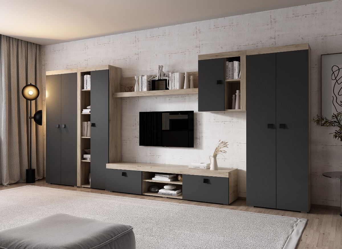 Living Ontario C5 DUO – Mobila sufragerie Living Ontario C5 DUO – Mobila sufragerie are un aspect contemporan / modern si este alcatuita din mai module. Puteti alege direct din configuratiile realizate de noi sau daca doriti puteti creea singuri propria configuratie de living combinand din corpurile de mobila pentru living. In functie de spatiul unde doriti sa amplasati mobila puteti adapta livingul. Livrare gratuita si rapida, 4-10 zile lucratoare prin flota proprie Suntem producatori de mobilier, fara intermediari Toate piesele de mobilier au o garantie de 2 ani Corpurile sunt construite din PAL melaminat de 16mm cu finisaj gri antracit si stejar k02 , cel din urma avand o textura similara lemnului, care creeaza un contrast rafinat si un ambient placut. Cantul aplicat este unul de 0,6 care le permite muchiilor sa fie placute la atingere . Dimensiuni Living Ontario C5 DUO – Mobila sufragerie Imaginea alaturata prezinta compartimentarea pentru mobila de sufragerie Ontario. Aceasta configuratie are 6 corpuri modulare , 2 suspendate si 4 pe sol. Spatii de depozitare cu usa cat si etajere si polita. Dulapurile au cate 2 spatii de depozitare si o bara pentru haine. Pot fi folosite si pentru haine cat si pentru obiecte diverse. Dimensiuni corpuri: Comoda TV: L 180 x A 35.2 x H 39.8 cm Soldat 1 usa: L 60 x A 30.4 x H 182 cm Dulap 2 usi x 2 buc: L 67.6 x A 30.4 x H 182 cm Corp Suspendat: L 60 x A 30.4 x H 69.8 cm Polita 1390 : L 139 x A 21.6 x H 34.8 cm Dimensiuni totale livin L 394.2 x A 35.2 x H 182 cm Spatiul de TV: diagonala max 150cm/59″ (sau mai mare) Recomandam un TV cu o diagonala de maxim 150cm/59″. Se pot pune si TV-uri cu diagonala mai mare mutand corpul suspendat mai in stanga livingului sau mai sus. Toate corpurile se pot pune pe stanga sau pe dreapta in functie de cum doriti. Nu este obligatoriu pozitionarea ca in prezentare. Ele nu sunt prinse unul de celalalt. Info si schite montaj mobila sufragerie DESCARCA SCHITA MONTAJ COMODA TV DESCARCA SCHITA MONTAJ SOLDAT 1 USA DESCARCA SCHITA MONTAJ POLITA DESCARCA SCHITA MONTAJ CORP SUSPENDAT DESCARCA SCHITA MONTAJ DULAP Atentie! Elementele de prindere de tipul dibluri, surub sau horsurub nu sunt incluse deoarce tipul de prindere difera in functie de tipul peretelui pe care urmeaza a se monta mobilierul (beton, caramida, BCA, rigips, lemn etc). Pretul afisat nu include alte accesorii sau obiecte de decor (TV, tablouri, elemente de iluminat, covor etc.) Dimensiunile sunt exprimate in cm si pot oscila intre ± 10 mm. Produsul se livreaza demontat si este insotit de accesorii si instructiuni de asamblare.