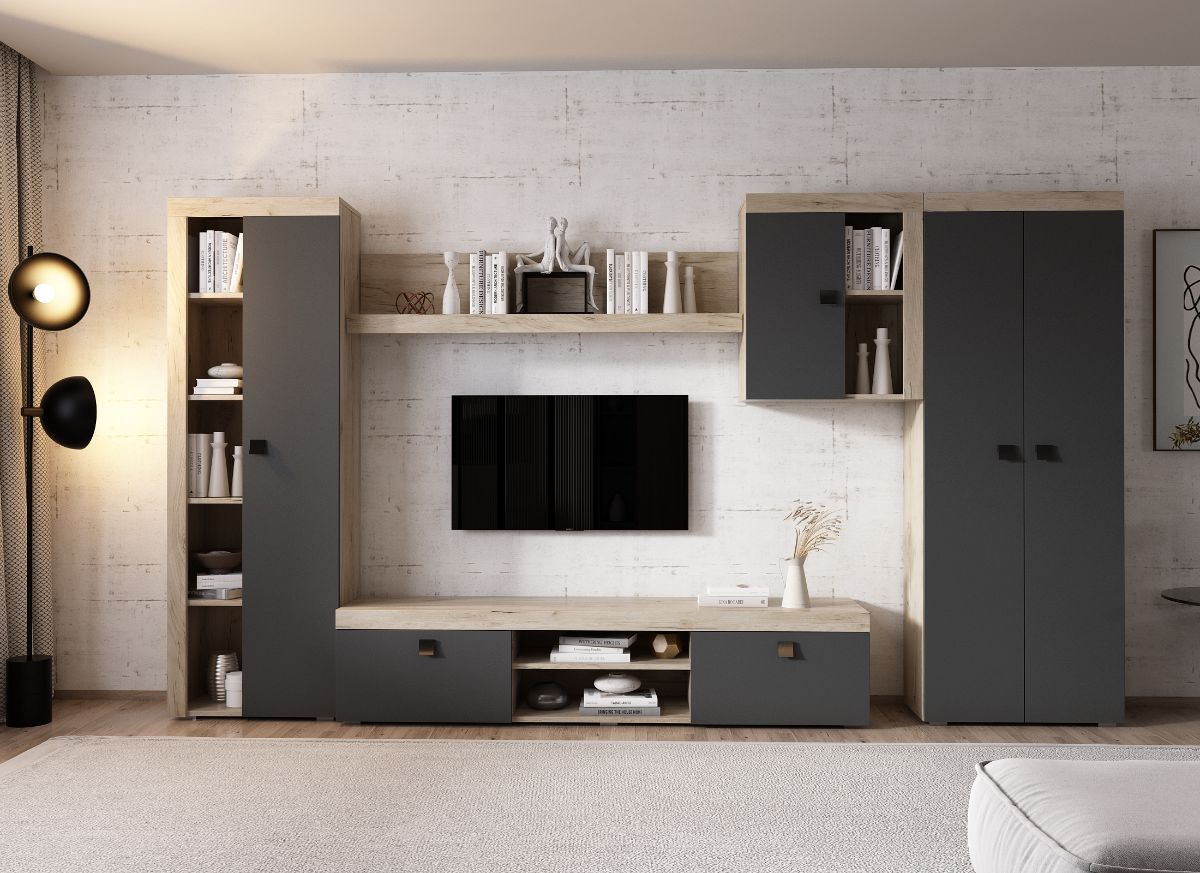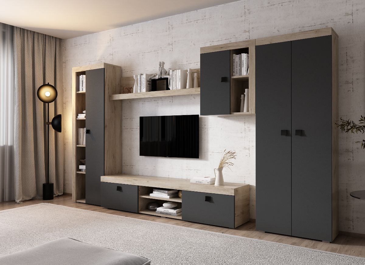 Living Ontario C5 UNO – Mobila sufragerie Living Ontario C5 UNO – Mobila sufragerie are un aspect contemporan / modern si este alcatuita din mai module. Puteti alege direct din configuratiile realizate de noi sau daca doriti puteti creea singuri propria configuratie de living combinand din corpurile de mobila pentru living. In functie de spatiul unde doriti sa amplasati mobila puteti adapta livingul. Livrare gratuita si rapida, 4-10 zile lucratoare prin flota proprie Suntem producatori de mobilier, fara intermediari Toate piesele de mobilier au o garantie de 2 ani Corpurile sunt construite din PAL melaminat de 16mm cu finisaj gri antracit si stejar k02 , cel din urma avand o textura similara lemnului, care creeaza un contrast rafinat si un ambient placut. Cantul aplicat este unul de 0,6 care le permite muchiilor sa fie placute la atingere . Dimensiuni Living Ontario C5 UNO – Mobila sufragerie Imaginea alaturata prezinta compartimentarea pentru mobila de sufragerie Ontario. Aceasta configuratie are 5 corpuri modulare , 2 suspendate si 3 pe sol. Spatii de depozitare cu usa cat si etajere si polita. Dulapul are 2 spatii de depozitare si o bara pentru haine. Poate fi folosit si pentru haine cat si pentru obiecte diverse. Dimensiuni corpuri: Comoda TV: L 180 x A 35.2 x H 39.8 cm Soldat 1 usa: L 60 x A 30.4 x H 182 cm Dulap 2 usi: L 67.6 x A 30.4 x H 182 cm Corp Suspendat: L 60 x A 30.4 x H 69.8 cm Polita 1390 : L 139 x A 21.6 x H 34.8 cm Dimensiuni totale livin L 326.6 x A 35.2 x H 182 cm Spatiul de TV: diagonala max 150cm/59″ (sau mai mare) Recomandam un TV cu o diagonala de maxim 150cm/59″. Se pot pune si TV-uri cu diagonala mai mare mutand corpul suspendat mai in stanga livingului sau mai sus. Toate corpurile se pot pune pe stanga sau pe dreapta in functie de cum doriti. Nu este obligatoriu pozitionarea ca in prezentare. Ele nu sunt prinse unul de celalalt. Info si schite montaj mobila sufragerie DESCARCA SCHITA MONTAJ COMODA TV DESCARCA SCHITA MONTAJ SOLDAT 1 USA DESCARCA SCHITA MONTAJ POLITA DESCARCA SCHITA MONTAJ CORP SUSPENDAT DESCARCA SCHITA MONTAJ DULAP Atentie! Elementele de prindere de tipul dibluri, surub sau horsurub nu sunt incluse deoarce tipul de prindere difera in functie de tipul peretelui pe care urmeaza a se monta mobilierul (beton, caramida, BCA, rigips, lemn etc). Pretul afisat nu include alte accesorii sau obiecte de decor (TV, tablouri, elemente de iluminat, covor etc.) Dimensiunile sunt exprimate in cm si pot oscila intre ± 10 mm. Produsul se livreaza demontat si este insotit de accesorii si instructiuni de asamblare.