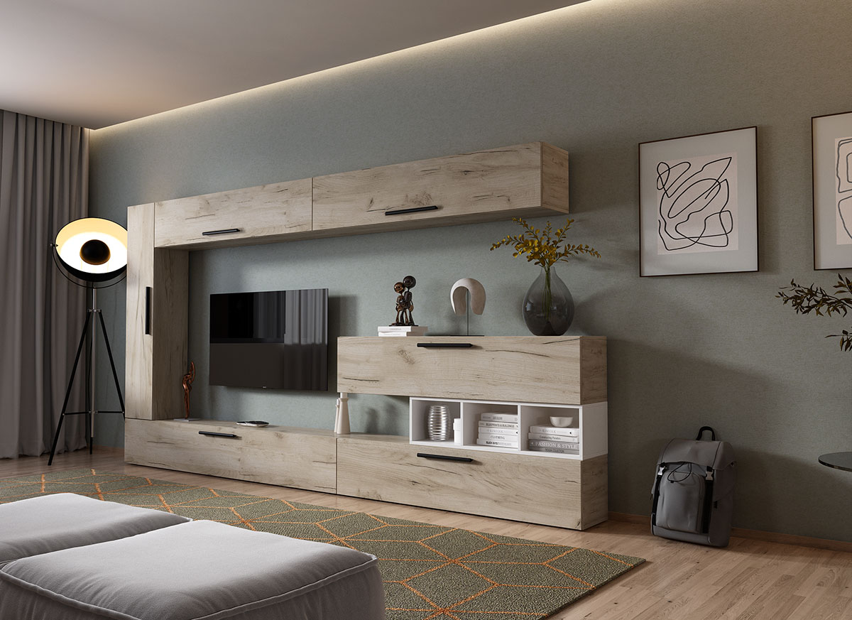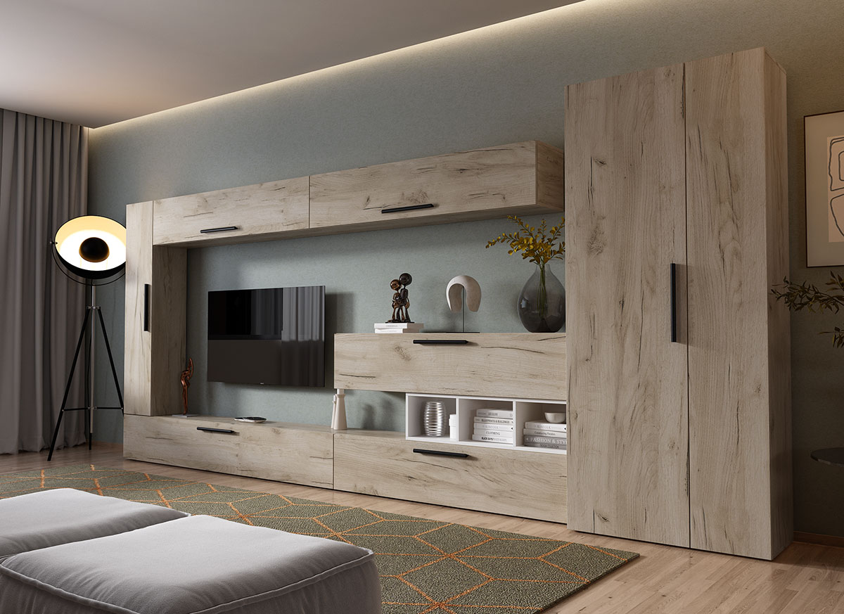 Living Pati 010 – Mobila Sufragerie Stejar Living Pati 010 – Mobila Sufragerie Stejar face parte dintr-o categorie de mobilier modern, contemporan ce imbina designul cu utilitatea. Familia de living Pati are 4 decoruri: stejar, alb, gri si beton . Am realizat peste 100 de configuratii din care puteti alege cu dimensiuni si stiluri diferite. Dulapul de haine este optional si puteti alege unul sau mai multe bucati. Livrare gratuita si rapida, 4-10 zile lucratoare prin flota proprie Suntem producatori de mobilier, fara intermediari Toate piesele de mobilier au o garantie de 2 ani Corpurile sunt construite din PAL melaminat de 16mm. Cantul aplicat este de 0,6 ce le permite muchiilor sa fie placute la atingere . Atentie! Elementele de prindere de tipul dibluri, surub sau horsurub nu sunt incluse deoarce tipul de prindere difera in functie de tipul peretelui pe care urmeaza a se monta mobilierul (beton, caramida, BCA, rigips, lemn etc). Video de prezentare familie Videoul de prezentare poate contine mai multe corpuri de mobilier sau mai putine in comparatie cu produsul de pe aceasta pagina. Scopul acestui video este de a detalia aspectul materialelor, accesoriilor cat si a familiei din care face parte. Dimensiuni Living Pati 010 – Mobila Sufragerie Stejar Imaginea alaturata prezinta compartimentarea pentru mobila de sufragerie Pati. Aceasta configuratie contine urmatoarele corpuri: 5 x Corp 1380: L 138 x H 29 x A 26.7 cm 1 x Corp 1850 : L 185 x H 29 x A 26.7 cm 1 x Corp decorativ: L 91.5 x H 23.2 x A 25 cm Optional dulap: L 79.8 x H 185 x A 35 cm Dimensiuni totale living Pati Fara dulap: L 323 x A 26.7 x H 170 cm Cu un dulap: L 402.8 x A 35 x H 185 cm Spatiul de TV: diagonala maxima 139 cm. Toate corpurile se pot pune pe stanga sau pe dreapta in functie de cum doriti. Nu este obligatoriu pozitionarea ca in prezentare. Ele nu sunt prinse unul de celalalt, sunt independente. SCHITA MONTAJ corp 1850 comoda SCHITA MONTAJ corp 1380 superior SCHITA MONTAJ corp 1380 vertical SCHITA MONTAJ corp 1380 comoda / inferior SCHITA MONTAJ CORP DECORATIV SCHITA MONTAJ dulap 2U Pati Pretul afisat nu include alte accesorii sau obiecte de decor (TV, tablouri, elemente de iluminat, covor etc.) Dimensiunile sunt exprimate in cm si pot oscila intre ± 10 mm. Produsul se livreaza demontat si este insotit de accesorii si instructiuni de asamblare.