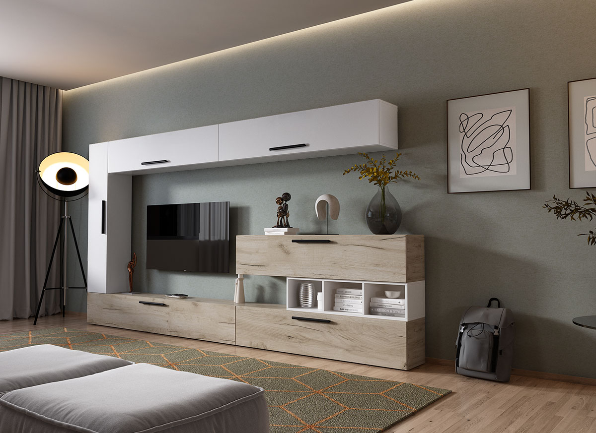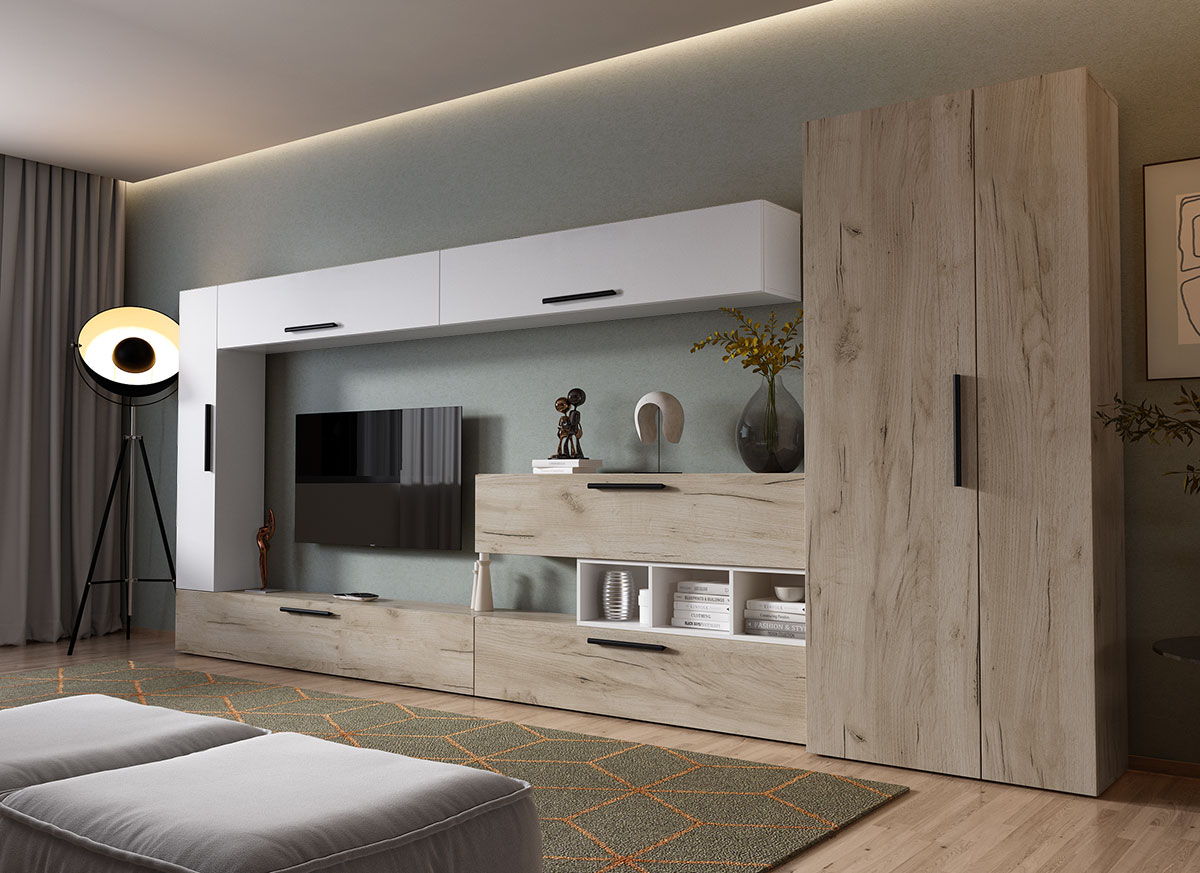 Living Pati 012 – Mobila Sufragerie Stejar + Alb Living Pati 012 – Mobila Sufragerie Stejar + Alb face parte dintr-o categorie de mobilier modern, contemporan ce imbina designul cu utilitatea. Familia de living Pati are 4 decoruri: stejar, alb, gri si beton . Am realizat peste 100 de configuratii din care puteti alege cu dimensiuni si stiluri diferite. Dulapul de haine este optional si puteti alege unul sau mai multe bucati. Livrare gratuita si rapida, 4-10 zile lucratoare prin flota proprie Suntem producatori de mobilier, fara intermediari Toate piesele de mobilier au o garantie de 2 ani Corpurile sunt construite din PAL melaminat de 16mm. Cantul aplicat este de 0,6 ce le permite muchiilor sa fie placute la atingere . Atentie! Elementele de prindere de tipul dibluri, surub sau horsurub nu sunt incluse deoarce tipul de prindere difera in functie de tipul peretelui pe care urmeaza a se monta mobilierul (beton, caramida, BCA, rigips, lemn etc). Video de prezentare familie Videoul de prezentare poate contine mai multe corpuri de mobilier sau mai putine in comparatie cu produsul de pe aceasta pagina. Scopul acestui video este de a detalia aspectul materialelor, accesoriilor cat si a familiei din care face parte. Dimensiuni Living Pati 012 – Mobila Sufragerie Stejar + Alb Imaginea alaturata prezinta compartimentarea pentru mobila de sufragerie Pati. Aceasta configuratie contine urmatoarele corpuri: 5 x Corp 1380: L 138 x H 29 x A 26.7 cm 1 x Corp 1850 : L 185 x H 29 x A 26.7 cm 1 x Corp decorativ: L 91.5 x H 23.2 x A 25 cm Optional dulap: L 79.8 x H 185 x A 35 cm Dimensiuni totale living Pati Fara dulap: L 323 x A 26.7 x H 170 cm Cu un dulap: L 402.8 x A 35 x H 185 cm Spatiul de TV: diagonala maxima 139 cm. Toate corpurile se pot pune pe stanga sau pe dreapta in functie de cum doriti. Nu este obligatoriu pozitionarea ca in prezentare. Ele nu sunt prinse unul de celalalt, sunt independente. SCHITA MONTAJ corp 1850 comoda SCHITA MONTAJ corp 1380 superior SCHITA MONTAJ corp 1380 vertical SCHITA MONTAJ corp 1380 comoda / inferior SCHITA MONTAJ CORP DECORATIV SCHITA MONTAJ dulap 2U Pati Pretul afisat nu include alte accesorii sau obiecte de decor (TV, tablouri, elemente de iluminat, covor etc.) Dimensiunile sunt exprimate in cm si pot oscila intre ± 10 mm. Produsul se livreaza demontat si este insotit de accesorii si instructiuni de asamblare.