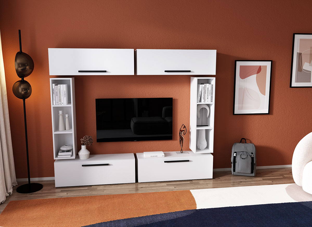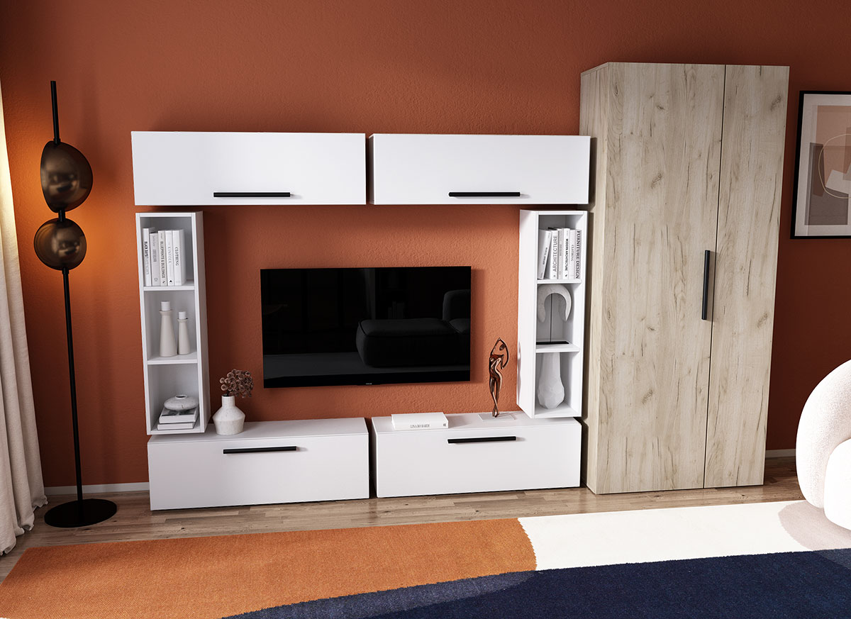 Living Pati 069 – Mobila Sufragerie Alba Living Pati 069 – Mobila Sufragerie Alba face parte dintr-o categorie de mobilier modern, contemporan ce imbina designul cu utilitatea. Familia de living Pati are 4 decoruri: stejar, alb, gri si beton . Am realizat peste 100 de configuratii din care puteti alege cu dimensiuni si stiluri diferite. Dulapul de haine este optional si puteti alege unul sau mai multe bucati. Livrare gratuita si rapida, 4-10 zile lucratoare prin flota proprie Suntem producatori de mobilier, fara intermediari Toate piesele de mobilier au o garantie de 2 ani Corpurile sunt construite din PAL melaminat de 16mm. Cantul aplicat este de 0,6 ce le permite muchiilor sa fie placute la atingere . Atentie! Elementele de prindere de tipul dibluri, surub sau horsurub nu sunt incluse deoarce tipul de prindere difera in functie de tipul peretelui pe care urmeaza a se monta mobilierul (beton, caramida, BCA, rigips, lemn etc). Video de prezentare familie Videoul de prezentare poate contine alte nuante, mai multe sau mai putine corpuri de mobilier in comparatie cu produsul de pe aceasta pagina. Scopul acestui video este de a detalia aspectul materialelor, accesoriilor cat si a familiei din care face parte. Dimensiuni Living Pati 069 – Mobila Sufragerie Alba Imaginea alaturata prezinta compartimentarea pentru mobila de sufragerie Pati. Aceasta configuratie contine urmatoarele corpuri: 4 x Corp 920: L 92 x H 29 x A 26.7 cm 2 x Corp decorativ: L 91.5 x H 23.2 x A 25 cm Optional dulap: L 79.8 x H 185 x A 35 cm Dimensiuni totale living Pati Fara dulap: L 190 x A 26.7 x H 160 cm Cu un dulap: L 276 x A 35 x H 185 cm Spatiul de TV: diagonala maxima 139 cm. Toate corpurile se pot pune pe stanga sau pe dreapta in functie de cum doriti. Nu este obligatoriu pozitionarea ca in prezentare. Ele nu sunt prinse unul de celalalt, sunt independente. SCHITA MONTAJ CORP 920 SUPERIOR SCHITA MONTAJ CORP 920 INFERIOR SCHITA MONTAJ CORP DECORATIV SCHITA MONTAJ dulap 2U Pati Pretul afisat nu include alte accesorii sau obiecte de decor (TV, tablouri, elemente de iluminat, covor etc.) Dimensiunile sunt exprimate in cm si pot oscila intre ± 10 mm. Produsul se livreaza demontat si este insotit de accesorii si instructiuni de asamblare.