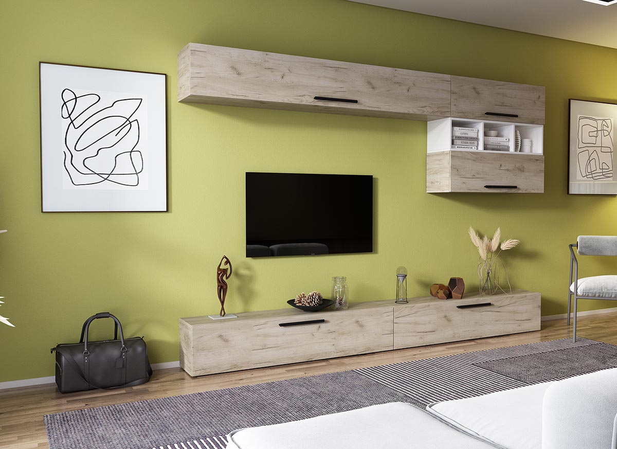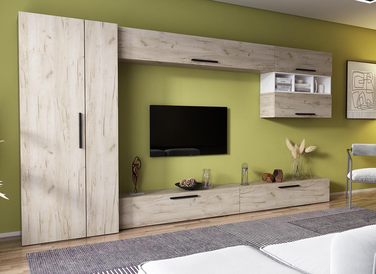 Living Pati 076 – Mobila Sufragerie Stejar + Alb Living Pati 076 – Mobila Sufragerie Stejar + Alb face parte dintr-o categorie de mobilier modern, contemporan ce imbina designul cu utilitatea. Familia de living Pati are 4 decoruri: stejar, alb, gri si beton . Am realizat peste 100 de configuratii din care puteti alege cu dimensiuni si stiluri diferite. Dulapul de haine este optional si puteti alege unul sau mai multe bucati. Livrare gratuita si rapida, 4-10 zile lucratoare prin flota proprie Suntem producatori de mobilier, fara intermediari Toate piesele de mobilier au o garantie de 2 ani Corpurile sunt construite din PAL melaminat de 16mm. Cantul aplicat este de 0,6 ce le permite muchiilor sa fie placute la atingere . Atentie! Elementele de prindere de tipul dibluri, surub sau horsurub nu sunt incluse deoarce tipul de prindere difera in functie de tipul peretelui pe care urmeaza a se monta mobilierul (beton, caramida, BCA, rigips, lemn etc). Video de prezentare familie Videoul de prezentare poate contine mai multe corpuri de mobilier sau mai putine in comparatie cu produsul de pe aceasta pagina. Scopul acestui video este de a detalia aspectul materialelor, accesoriilor cat si a familiei din care face parte. Dimensiuni Living Pati 076 – Mobila Sufragerie Stejar + Alb Imaginea alaturata prezinta compartimentarea pentru mobila de sufragerie Pati. Aceasta configuratie contine urmatoarele corpuri: 1 x Corp 1850: L 185 x H 29 x A 26.7 cm 2 x Corp 920: L 92 x H 29 x A 26.7 cm 1 x Corp decorativ: L 91.5 x H 23.2 x A 25 cm 2 x Corp 1380: L 138 x H 29 x A 26.7 cm Optional dulap: L 79.8 x H 185 x A 35 cm Dimensiuni totale living Pati Fara dulap: L 276 x A 26.7 x H 170 cm Cu un dulap: L 355.8 x A 35 x H 185 cm Spatiul de TV: diagonala maxima 139 cm. Toate corpurile se pot pune pe stanga sau pe dreapta in functie de cum doriti. Nu este obligatoriu pozitionarea ca in prezentare. Ele nu sunt prinse unul de celalalt, sunt independente. SCHITA MONTAJ CORP DECORATIV SCHITA MONTAJ CORP 1380 COMODA SCHITA MONTAJ CORP 1850 SUPERIOR SCHITA MONTAJ CORP 920 SUPERIOR SCHITA MONTAJ dulap 2U Pati Pretul afisat nu include alte accesorii sau obiecte de decor (TV, tablouri, elemente de iluminat, covor etc.) Dimensiunile sunt exprimate in cm si pot oscila intre ± 10 mm. Produsul se livreaza demontat si este insotit de accesorii si instructiuni de asamblare.