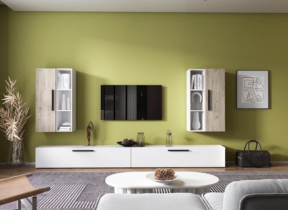 Living Pati 089 – Mobila Sufragerie Stejar + Alb Living Pati 089 – Mobila Sufragerie Stejar + Alb face parte dintr-o categorie de mobilier modern, contemporan ce imbina designul cu utilitatea. Familia de living Pati are 4 decoruri: stejar, alb, gri si beton . Am realizat peste 100 de configuratii din care puteti alege cu dimensiuni si stiluri diferite. Dulapul de haine este optional si puteti alege unul sau mai multe bucati. Livrare gratuita si rapida, 4-10 zile lucratoare prin flota proprie Suntem producatori de mobilier, fara intermediari Toate piesele de mobilier au o garantie de 2 ani Corpurile sunt construite din PAL melaminat de 16mm. Cantul aplicat este de 0,6 ce le permite muchiilor sa fie placute la atingere . Atentie! Elementele de prindere de tipul dibluri, surub sau horsurub nu sunt incluse deoarce tipul de prindere difera in functie de tipul peretelui pe care urmeaza a se monta mobilierul (beton, caramida, BCA, rigips, lemn etc). Video de prezentare familie Videoul de prezentare poate contine mai multe corpuri de mobilier sau mai putine in comparatie cu produsul de pe aceasta pagina. Scopul acestui video este de a detalia aspectul materialelor, accesoriilor cat si a familiei din care face parte. Dimensiuni Living Pati 089 – Mobila Sufragerie Stejar + Alb Imaginea alaturata prezinta compartimentarea pentru mobila de sufragerie Pati. Aceasta configuratie contine urmatoarele corpuri: 2 x Corp 920: L 92 x H 29 x A 26.7 cm 2 x Corp 1380: L 138 x H 29 x A 26.7 cm 2 x Corp decorativ: L 91.5 x H 23.2 x A 25 cm Optional dulap: L 79.8 x H 185 x A 35 cm Dimensiuni totale living Pati Fara dulap: L 276 x A 26.7 x H 160 cm Cu un dulap: L 355.8 x A 35 x H 185 cm Spatiul de TV: diagonala maxima 139 cm. Toate corpurile se pot pune pe stanga sau pe dreapta in functie de cum doriti. Nu este obligatoriu pozitionarea ca in prezentare. Ele nu sunt prinse unul de celalalt, sunt independente. SCHITA MONTAJ CORP 920 VERTICAL SCHITA MONTAJ CORP 1380 COMODA SCHITA MONTAJ CORP DECORATIV SCHITA MONTAJ dulap 2U Pati Pretul afisat nu include alte accesorii sau obiecte de decor (TV, tablouri, elemente de iluminat, covor etc.) Dimensiunile sunt exprimate in cm si pot oscila intre ± 10 mm. Produsul se livreaza demontat si este insotit de accesorii si instructiuni de asamblare.