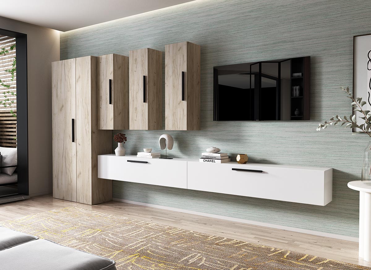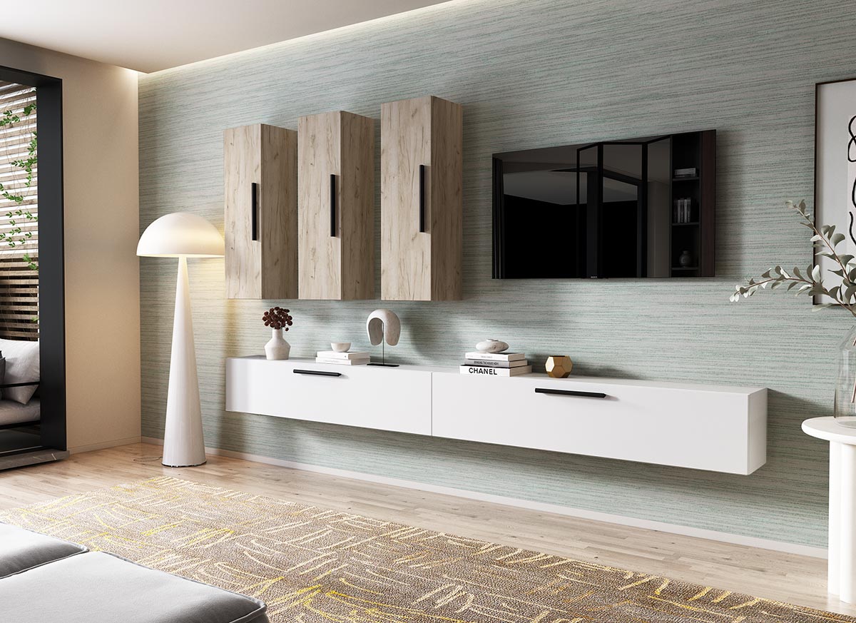 Living Pati 095 – Mobila Sufragerie Alba + Stejar Living Pati 095 – Mobila Sufragerie Alba + Stejar face parte dintr-o categorie de mobilier modern, contemporan ce imbina designul cu utilitatea. Familia de living Pati are 4 decoruri: stejar, alb, gri si beton . Am realizat peste 100 de configuratii din care puteti alege cu dimensiuni si stiluri diferite. Dulapul de haine este optional si puteti alege unul sau mai multe bucati. Livrare gratuita si rapida, 4-10 zile lucratoare prin flota proprie Suntem producatori de mobilier, fara intermediari Toate piesele de mobilier au o garantie de 2 ani Corpurile sunt construite din PAL melaminat de 16mm. Cantul aplicat este de 0,6 ce le permite muchiilor sa fie placute la atingere . Atentie! Elementele de prindere de tipul dibluri, surub sau horsurub nu sunt incluse deoarce tipul de prindere difera in functie de tipul peretelui pe care urmeaza a se monta mobilierul (beton, caramida, BCA, rigips, lemn etc). Video de prezentare familie Videoul de prezentare poate contine mai multe corpuri de mobilier sau mai putine in comparatie cu produsul de pe aceasta pagina. Scopul acestui video este de a detalia aspectul materialelor, accesoriilor cat si a familiei din care face parte. Dimensiuni Living Pati 095 – Mobila Sufragerie Alba + Stejar Imaginea alaturata prezinta compartimentarea pentru mobila de sufragerie Pati. Aceasta configuratie contine urmatoarele corpuri: 3 x Corp 920: L 92 x H 29 x A 26.7 cm 2 x Corp 1380: L 138 x H 29 x A 26.7 cm Optional dulap: L 79.8 x H 185 x A 35 cm Dimensiuni totale living Pati Fara dulap: L 276 x A 26.7 x H 185 cm Cu un dulap: L 355.8 x A 35 x H 185 cm Spatiul de TV: diagonala maxima 139 cm. Toate corpurile se pot pune pe stanga sau pe dreapta in functie de cum doriti. Nu este obligatoriu pozitionarea ca in prezentare. Ele nu sunt prinse unul de celalalt, sunt independente. SCHITA MONTAJ CORP 920 VERTICAL SCHITA MONTAJ CORP 1380 INFERIOR SCHITA MONTAJ dulap 2U Pati Pretul afisat nu include alte accesorii sau obiecte de decor (TV, tablouri, elemente de iluminat, covor etc.) Dimensiunile sunt exprimate in cm si pot oscila intre ± 10 mm. Produsul se livreaza demontat si este insotit de accesorii si instructiuni de asamblare.