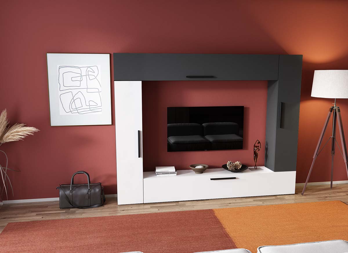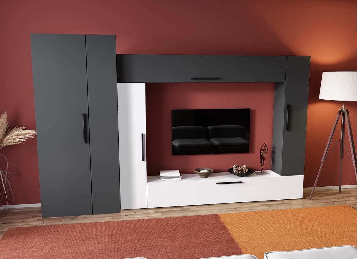 Living Pati 155 – Mobila Sufragerie Gri Antracit + Alb Living Pati 155 – Mobila Sufragerie Gri Antracit + Alb face parte dintr-o categorie de mobilier modern, contemporan ce imbina designul cu utilitatea. Familia de living Pati are 4 decoruri: stejar, alb, gri si beton . Am realizat peste 100 de configuratii din care puteti alege cu dimensiuni si stiluri diferite. Dulapul de haine este optional si puteti alege unul sau mai multe bucati. Livrare gratuita si rapida, 4-10 zile lucratoare prin flota proprie Suntem producatori de mobilier, fara intermediari Toate piesele de mobilier au o garantie de 2 ani Corpurile sunt construite din  PAL melaminat  de 16mm. Cantul aplicat este de 0,6 ce le permite muchiilor sa fie placute la atingere . Atentie! Elementele de prindere de tipul dibluri, surub sau horsurub nu sunt incluse deoarce tipul de prindere difera in functie de tipul peretelui pe care urmeaza a se monta mobilierul (beton, caramida, BCA, rigips, lemn etc). Video de prezentare familie Videoul de prezentare poate contine mai multe corpuri de mobilier sau mai putine in comparatie cu produsul de pe aceasta pagina. Scopul acestui video este de a detalia aspectul materialelor, accesoriilor cat si a familiei din care face parte. Dimensiuni Living Pati 155 – Mobila Sufragerie Gri Antracit + Alb Imaginea alaturata prezinta compartimentarea pentru mobila de sufragerie Pati. Aceasta configuratie contine urmatoarele corpuri: 2 x Corp 1380: L 138 x H 29 x A 26.7 cm 2 x Corp 1850: L 185 x H 29 x A 26.7 cm Optional dulap: L 79.8 x H 185 x A 35 cm Dimensiuni totale living Pati Fara dulap:  L 214 x A 26.7 x H 170 cm Cu un dulap:  L 293.8 x A 35 x H 185 cm Spatiul de TV: diagonala maxima 139 cm. Toate corpurile se pot pune pe stanga sau pe dreapta in functie de cum doriti. Nu este obligatoriu pozitionarea ca in prezentare. Ele nu sunt prinse unul de celalalt, sunt independente. SCHITA MONTAJ CORP 1850 SUSPENDAT SCHITA MONTAJ CORP 1850 COMODA SCHITA MONTAJ CORP 1380 VERTICAL SCHITA MONTAJ dulap 2U Pati Pretul afisat nu include alte accesorii sau obiecte de decor (TV, tablouri, elemente de iluminat, covor etc.)  Dimensiunile sunt exprimate in cm si pot oscila intre ± 10 mm.  Produsul se livreaza demontat si este insotit de accesorii si instructiuni de asamblare.