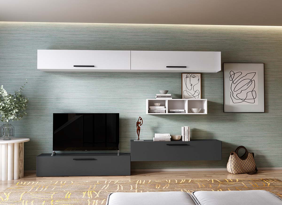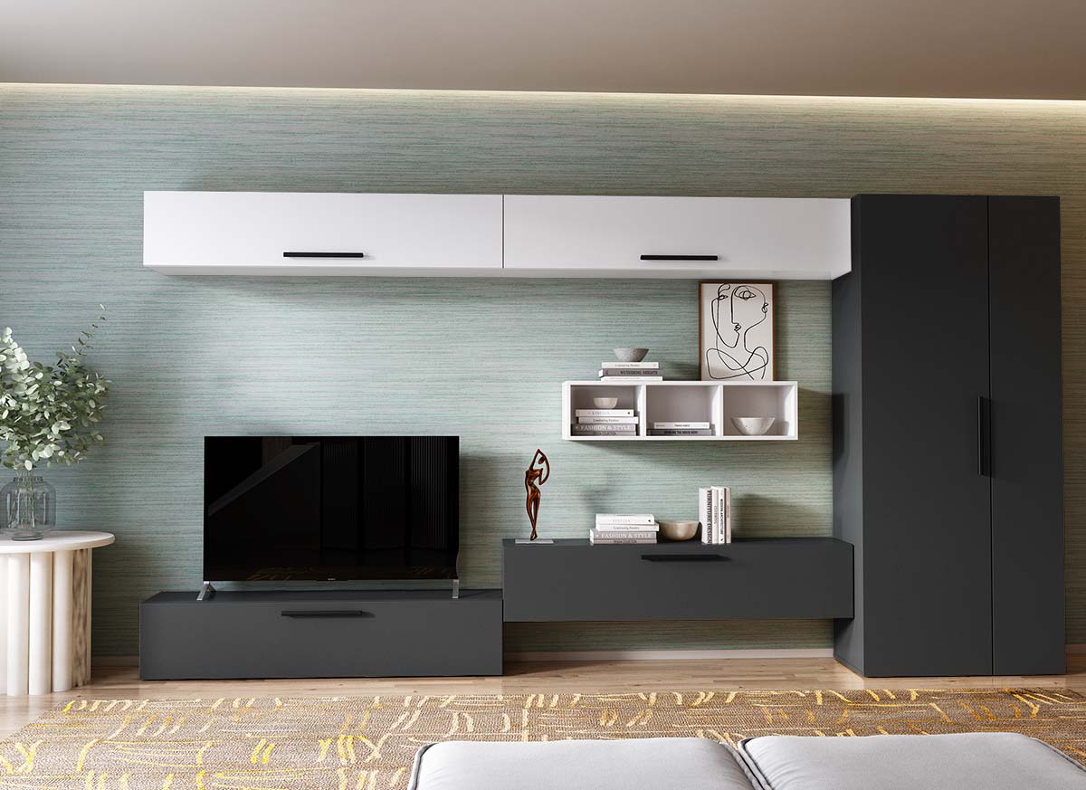 Living Pati 201 – Mobila Sufragerie Gri Antracit + Alb Living Pati 201 – Mobila Sufragerie Gri Antracit + Alb face parte dintr-o categorie de mobilier modern, contemporan ce imbina designul cu utilitatea. Familia de living Pati are 4 decoruri: stejar, alb, gri si beton . Am realizat peste 100 de configuratii din care puteti alege cu dimensiuni si stiluri diferite. Dulapul de haine este optional si puteti alege unul sau mai multe bucati. Livrare gratuita si rapida, 4-10 zile lucratoare prin flota proprie Suntem producatori de mobilier, fara intermediari Toate piesele de mobilier au o garantie de 2 ani Corpurile sunt construite din PAL melaminat de 16mm. Cantul aplicat este de 0,6 ce le permite muchiilor sa fie placute la atingere . Atentie! Elementele de prindere de tipul dibluri, surub sau horsurub nu sunt incluse deoarce tipul de prindere difera in functie de tipul peretelui pe care urmeaza a se monta mobilierul (beton, caramida, BCA, rigips, lemn etc). Video de prezentare familie Videoul de prezentare poate contine mai multe corpuri de mobilier sau mai putine in comparatie cu produsul de pe aceasta pagina. Scopul acestui video este de a detalia aspectul materialelor, accesoriilor cat si a familiei din care face parte. Dimensiuni Living Pati 201 – Mobila Sufragerie Gri Antracit + Alb Imaginea alaturata prezinta compartimentarea pentru mobila de sufragerie Pati. Aceasta configuratie contine urmatoarele corpuri: 4 x Corp 1380: L 138 x H 29 x A 26.7 cm 1 x Corp decorativ: L 91.5 x H 23.2 x A 25 cm Optional dulap: L 79.8 x H 185 x A 35 cm Dimensiuni totale living Pati Fara dulap: L 276 x A 26.7 x H 185 cm Cu un dulap: L 355.8 x A 35 x H 185 cm Spatiul de TV: diagonala maxima 139 cm. Toate corpurile se pot pune pe stanga sau pe dreapta in functie de cum doriti. Nu este obligatoriu pozitionarea ca in prezentare. Ele nu sunt prinse unul de celalalt, sunt independente. SCHITA MONTAJ corp 1380 comoda / inferior SCHITA MONTAJ CORP 1380 SUPERIOR SCHITA MONTAJ CORP DECORATIV SCHITA MONTAJ dulap 2U Pati Pretul afisat nu include alte accesorii sau obiecte de decor (TV, tablouri, elemente de iluminat, covor etc.) Dimensiunile sunt exprimate in cm si pot oscila intre ± 10 mm. Produsul se livreaza demontat si este insotit de accesorii si instructiuni de asamblare.