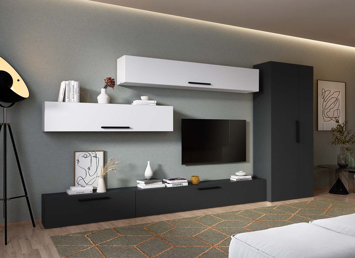 Living Pati 205 – Mobila Sufragerie Gri Antracit + Alb Living Pati 205 – Mobila Sufragerie Gri Antracit + Alb face parte dintr-o categorie de mobilier modern, contemporan ce imbina designul cu utilitatea. Familia de living Pati are 4 decoruri: stejar, alb, gri si beton . Am realizat peste 100 de configuratii din care puteti alege cu dimensiuni si stiluri diferite. Dulapul de haine este optional si puteti alege unul sau mai multe bucati. Livrare gratuita si rapida, 4-10 zile lucratoare prin flota proprie Suntem producatori de mobilier, fara intermediari Toate piesele de mobilier au o garantie de 2 ani Corpurile sunt construite din PAL melaminat de 16mm. Cantul aplicat este de 0,6 ce le permite muchiilor sa fie placute la atingere . Atentie! Elementele de prindere de tipul dibluri, surub sau horsurub nu sunt incluse deoarce tipul de prindere difera in functie de tipul peretelui pe care urmeaza a se monta mobilierul (beton, caramida, BCA, rigips, lemn etc). Video de prezentare familie Videoul de prezentare poate contine mai multe corpuri de mobilier sau mai putine in comparatie cu produsul de pe aceasta pagina. Scopul acestui video este de a detalia aspectul materialelor, accesoriilor cat si a familiei din care face parte. Dimensiuni Living Pati 205 – Mobila Sufragerie Gri Antracit + Alb Imaginea alaturata prezinta compartimentarea pentru mobila de sufragerie Pati. Aceasta configuratie contine urmatoarele corpuri: 1 x Corp 920: L 92 x H 29 x A 26.7 cm 1 x Corp 1380: L 138 x H 29 x A 26.7 cm 2 x Corp 1850 : L 185 x H 29 x A 26.7 cm Optional dulap: L 79.8 x H 185 x A 35 cm Dimensiuni totale living Pati Fara dulap: L 277 x A 26.7 x H 180 cm Cu un dulap: L 356.8 x A 35 x H 185cm Spatiul de TV: diagonala maxima 139 cm. Toate corpurile se pot pune pe stanga sau pe dreapta in functie de cum doriti. Nu este obligatoriu pozitionarea ca in prezentare. Ele nu sunt prinse unul de celalalt, sunt independente. SCHITA MONTAJ corp 1850 suspendat SCHITA MONTAJ corp 1850 comoda SCHITA MONTAJ corp 1380 SCHITA MONTAJ corp 920 SCHITA MONTAJ dulap 2U Pati Pretul afisat nu include alte accesorii sau obiecte de decor (TV, tablouri, elemente de iluminat, covor etc.) Dimensiunile sunt exprimate in cm si pot oscila intre ± 10 mm. Produsul se livreaza demontat si este insotit de accesorii si instructiuni de asamblare.