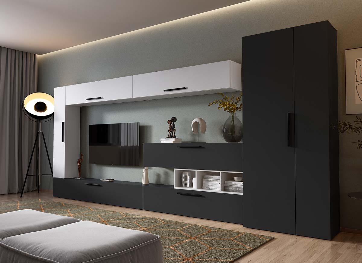 Living Pati 215 – Mobila Sufragerie Gri Antracit + Alb Living Pati 215 – Mobila Sufragerie Gri Antracit + Alb face parte dintr-o categorie de mobilier modern, contemporan ce imbina designul cu utilitatea. Familia de living Pati are 4 decoruri: stejar, alb, gri si beton . Am realizat peste 100 de configuratii din care puteti alege cu dimensiuni si stiluri diferite. Dulapul de haine este optional si puteti alege unul sau mai multe bucati. Livrare gratuita si rapida, 4-10 zile lucratoare prin flota proprie Suntem producatori de mobilier, fara intermediari Toate piesele de mobilier au o garantie de 2 ani Corpurile sunt construite din PAL melaminat de 16mm. Cantul aplicat este de 0,6 ce le permite muchiilor sa fie placute la atingere . Atentie! Elementele de prindere de tipul dibluri, surub sau horsurub nu sunt incluse deoarce tipul de prindere difera in functie de tipul peretelui pe care urmeaza a se monta mobilierul (beton, caramida, BCA, rigips, lemn etc). Video de prezentare familie Videoul de prezentare poate contine mai multe corpuri de mobilier sau mai putine in comparatie cu produsul de pe aceasta pagina. Scopul acestui video este de a detalia aspectul materialelor, accesoriilor cat si a familiei din care face parte. Dimensiuni Living Pati 215 – Mobila Sufragerie Gri Antracit + Alb Imaginea alaturata prezinta compartimentarea pentru mobila de sufragerie Pati. Aceasta configuratie contine urmatoarele corpuri: 5 x Corp 1380: L 138 x H 29 x A 26.7 cm 1 x Corp 1850 : L 185 x H 29 x A 26.7 cm 1 x Corp decorativ: L 91.5 x H 23.2 x A 25 cm Optional dulap: L 79.8 x H 185 x A 35 cm Dimensiuni totale living Pati Fara dulap: L 323 x A 26.7 x H 170 cm Cu un dulap: L 402.8 x A 35 x H 185 cm Spatiul de TV: diagonala maxima 139 cm. Toate corpurile se pot pune pe stanga sau pe dreapta in functie de cum doriti. Nu este obligatoriu pozitionarea ca in prezentare. Ele nu sunt prinse unul de celalalt, sunt independente. SCHITA MONTAJ corp 1850 comoda SCHITA MONTAJ corp 1380 superior SCHITA MONTAJ corp 1380 vertical SCHITA MONTAJ corp 1380 comoda / inferior SCHITA MONTAJ CORP DECORATIV SCHITA MONTAJ dulap 2U Pati Pretul afisat nu include alte accesorii sau obiecte de decor (TV, tablouri, elemente de iluminat, covor etc.) Dimensiunile sunt exprimate in cm si pot oscila intre ± 10 mm. Produsul se livreaza demontat si este insotit de accesorii si instructiuni de asamblare.