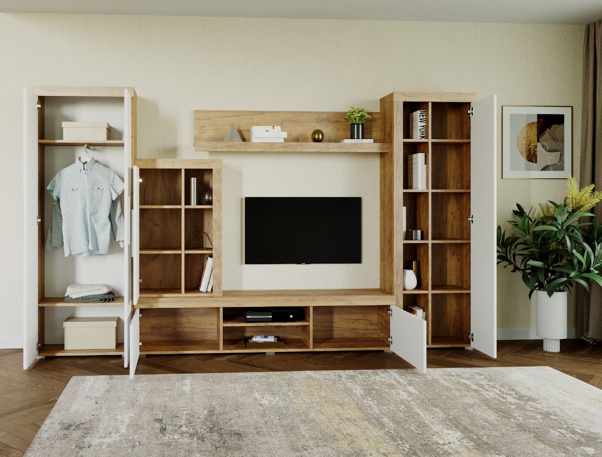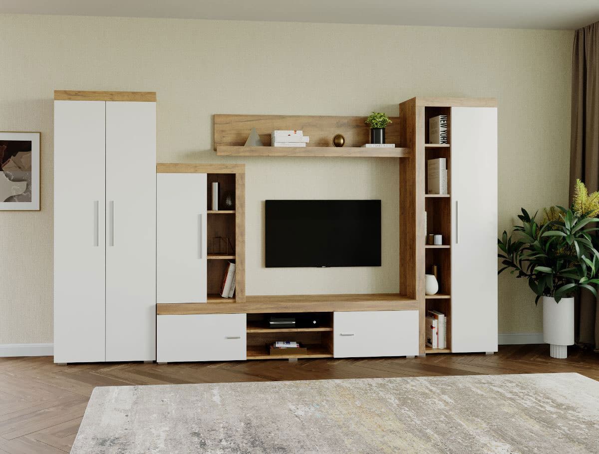 Living Milan Modul A Comoda Lunga Living Milan Modul B Comoda Inalta Living Milan Modul C Soldat 1 usa Living Milan – Modul F / G Polita Living Milan – Modul H Dulap Mobila sufragerie – Living Milan C4 UNO Stejar Mobila sufragerie – Living Milan C4 UNO Stejar face parte din familia de mobila pentru living Milan. Aceasta familie are un aspect modern si este compusa din mai multe module. Fara surprize la livrare, diferente de culoare sau calitate Livrare gratuita si rapida, 4-10 zile lucratoare prin flota proprie Suntem producatori de mobilier, fara intermediari Toate piesele de mobilier au o garantie de 2 ani Puteti alege direct din configuratiile realizate de noi sau daca doriti puteti creea singuri propria configuratie de living combinand din cele 8 corpuri de mobila. In functie de spatiul unde doriti sa amplasati mobila puteti adapta livingul pentru o potrivire perfecta. Corpurile sunt construite din PAL Kronospan melaminat de 16mm cu finisaj Stejar Auriu si Alb Mat, o textura similara lemnului, care creeaza un contrast rafinat si un ambient placut. Cantul aplicat este unul de 0,6 care le permite muchiilor sa fie plăcute la atingere fiind finisate si atent retusate. Dimensiuni Mobila sufragerie – Living Milan C4 UNO Stejar Imaginea alaturata prezinta compartimentarea interioara si exterioara pentru mobila de sufragerie Milan. Aceasta configuratie are 5 corpuri modulare , 1 suspendat si 4 pe sol. Spatii de depozitare cu usa cat si etajere si polita. Dulapul are 2 spatii de depozitare si o bara pentru haine. Poate fi folosit si pentru haine cat si pentru obiecte diverse. Dimensiuni corpuri: Comoda TV: L 180 x A 35.2 x H 39.8cm Comoda Inalta: L 60 x A 30.4 x H 96.8cm Dulap 2 usi: L 67.6 x A 30.4 x H 182cm Soldat 1 usa: L 60 x A 30.4 x H 182cm Polita 1390 : L 139 x A 21.6 x H 34.8cm Dimensiuni totale livin L 307.6 x A 35.2 x H 182cm Spatiul de TV: diagonala max 126cm/50″ (sau mai mare) Recomandam un TV cu o diagonala de maxim 126cm/50″. Se pot pune si TV-uri cu diagonala mai mare mutand corpul comoda inalta. Dulapul si toate corpurile se pot pune pe stanga sau pe dreapta in functie de cum doriti. Nu este obligatoriu pozitionarea ca in prezentare. Ele nu sunt prinse fix unul de celalalt. Info si schite montaj mobila sufragerie DESCARCA SCHITA MONTAJ COMODA LUNGA MILAN DESCARCA SCHITA MONTAJ COMODA INALTA MILAN DESCARCA SCHITA MONTAJ CORP INALT MILAN DESCARCA SCHITA MONTAJ POLITA MILAN DESCARCA SCHITA MONTAJ DULAP MILAN Atentie! Elementele de prindere de tipul dibluri, surub sau horsurub nu sunt incluse deoarce tipul de prindere difera in functie de tipul peretelui pe care urmeaza a se monta mobilierul (beton, caramida, BCA, rigips, lemn etc). Pretul afisat nu include alte accesorii sau obiecte de decor (TV, tablouri, elemente de iluminat, covor etc.). Dimensiunile sunt exprimate in cm si pot oscila intre ± 10 mm. Produsul se livreaza demontat si este insotit de accesorii si instructiuni de asamblare.