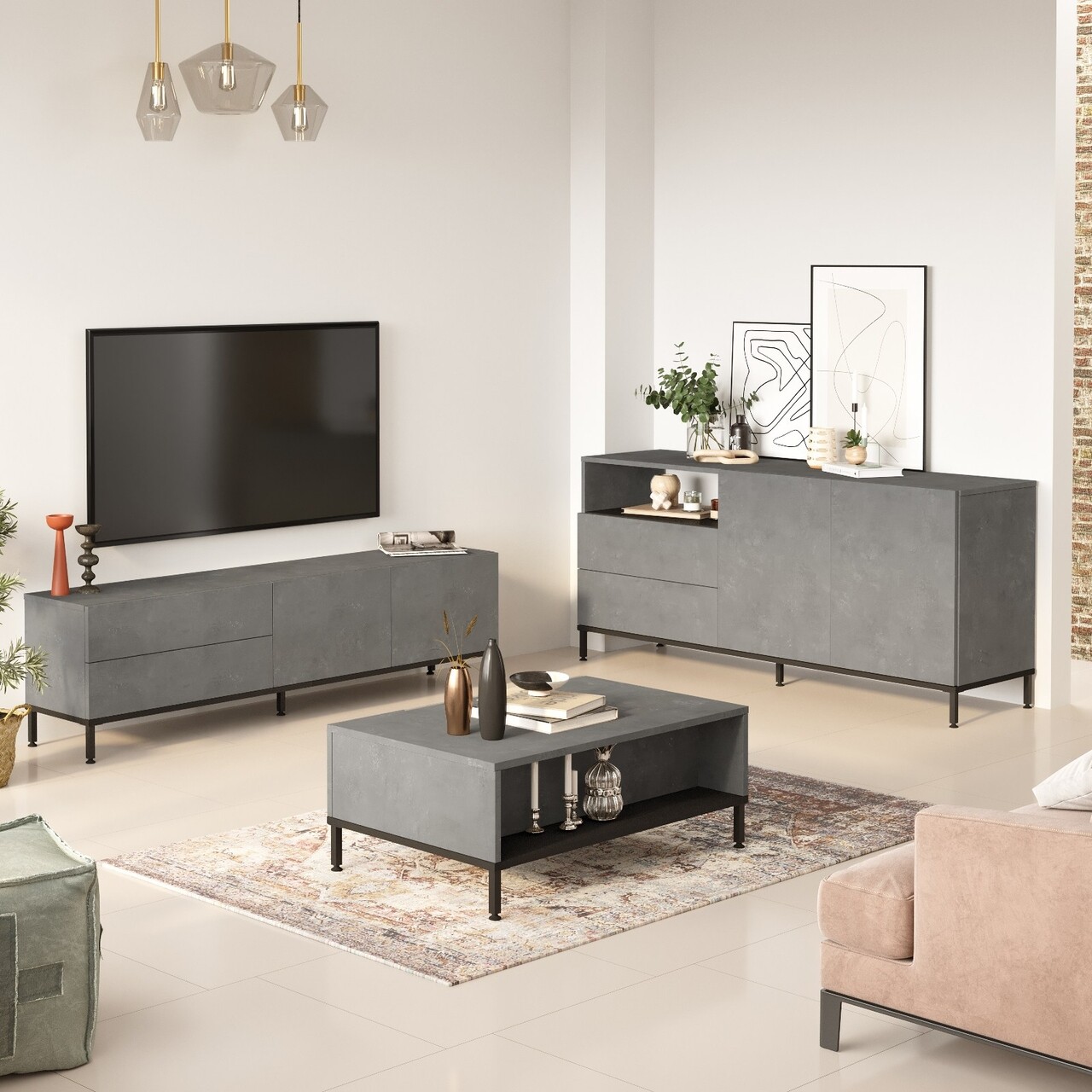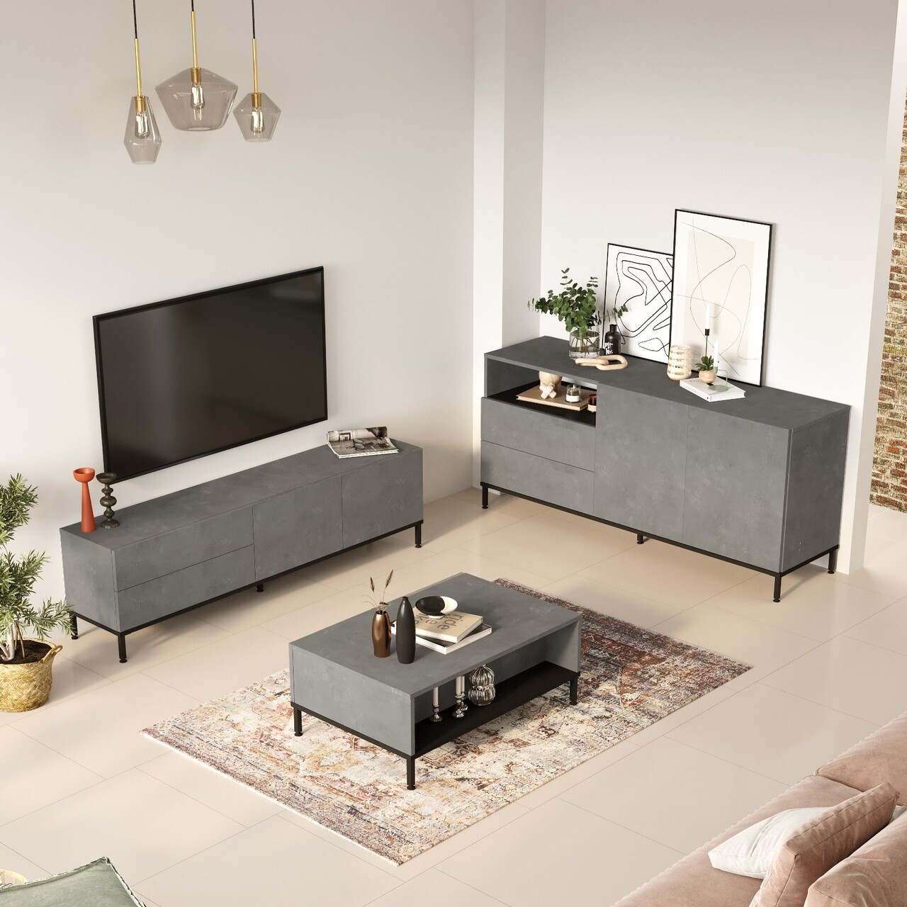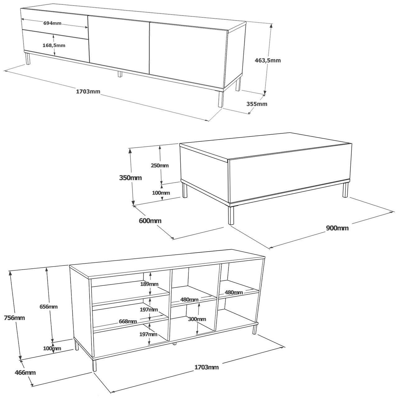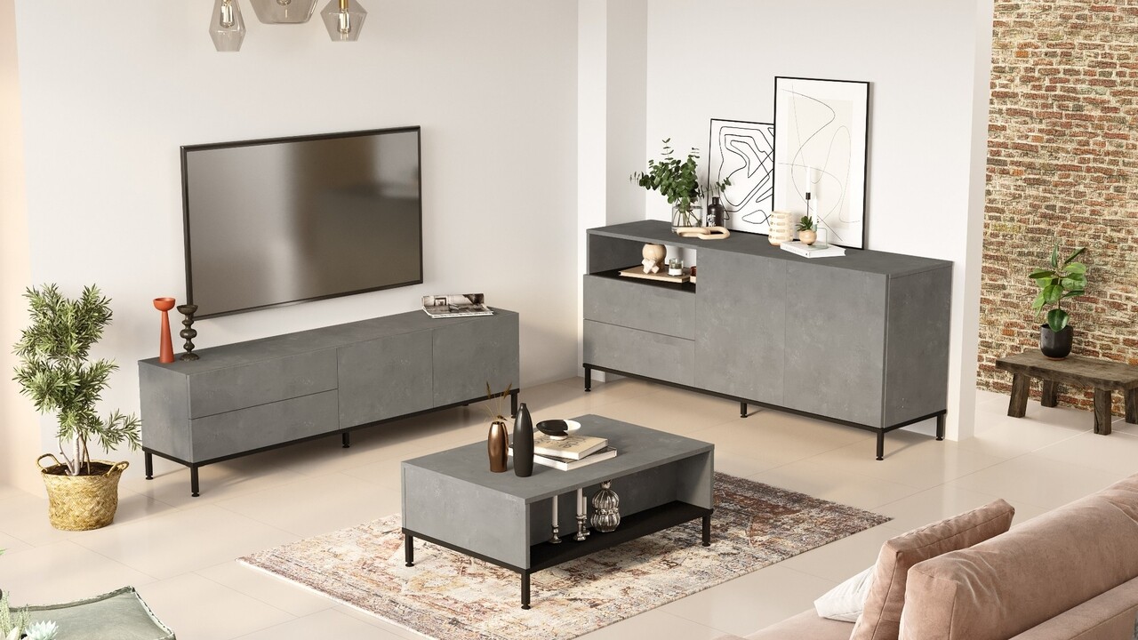 Setul este format din: comoda TV 170.3 x 46.35 x 35.5 cm (Lxhxl), masuta de cafea 90 x 35 x 60 cm (Lxhxl), consola 170.3 x 75.6 x 46.6 cm (Lxhxl).Inaltime picioare: 10 cm.Compozitie material: pal melaminat, picioare din metal.Grosime: 1.8 cm.