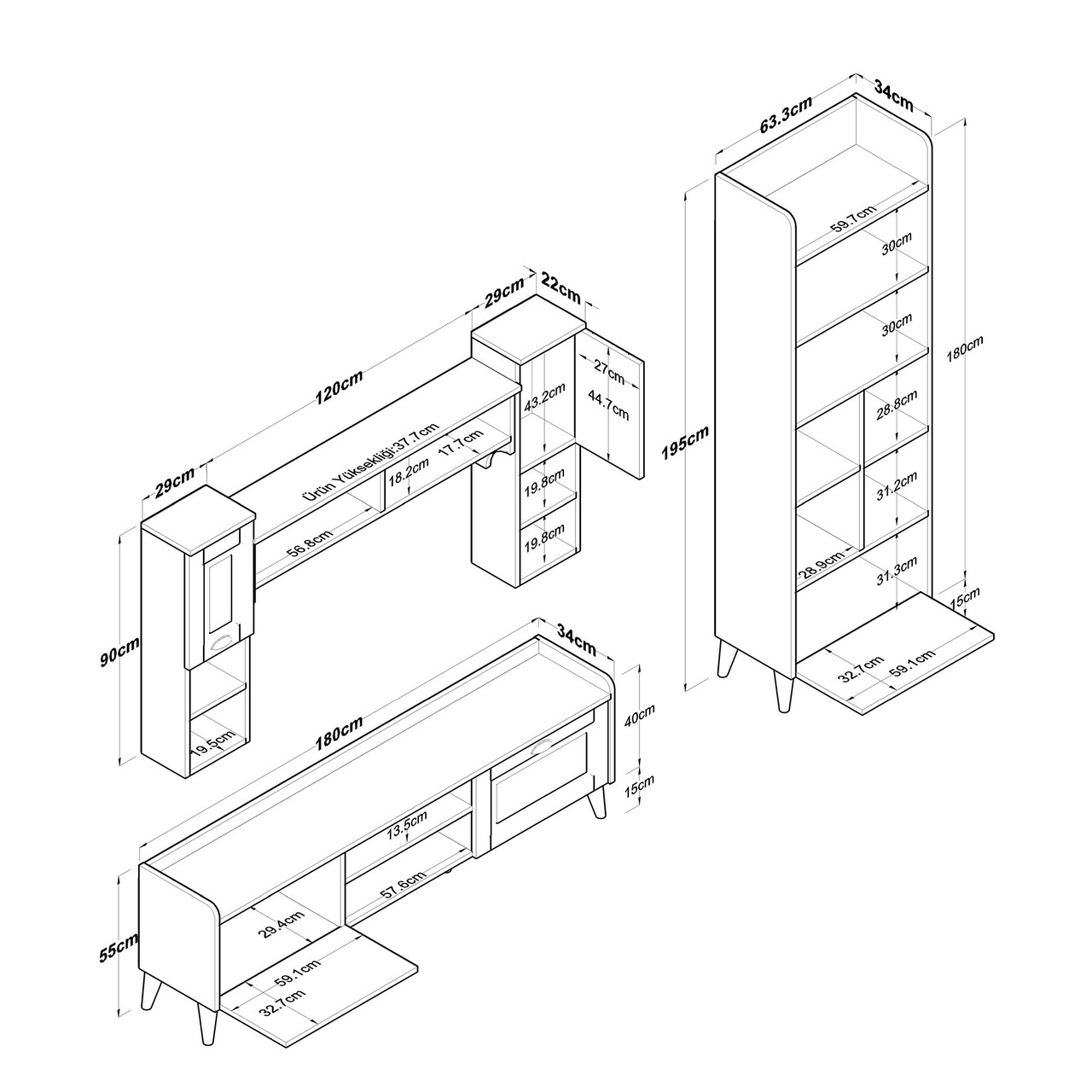 Setul este format din:Comoda TV: 180 x 55 x 34 cm (Lxhxl);Raft perete: 178 x 90 x 22 cm (Lxhxl);Raft pentru carti: 63 x 195 x 34 cm (Lxhxl).Compozitie material: pal melaminat.Grosime: 1.8 cm.