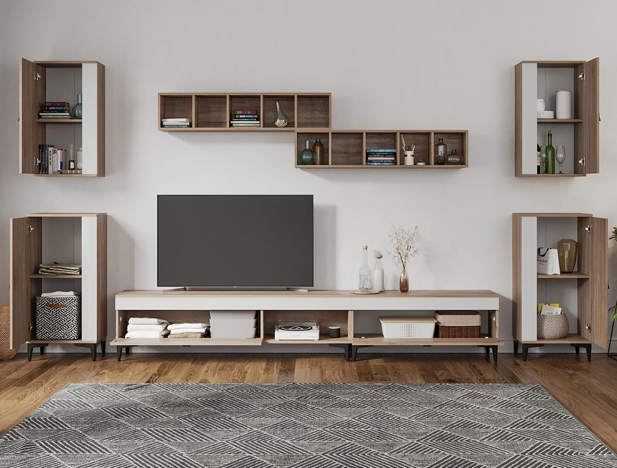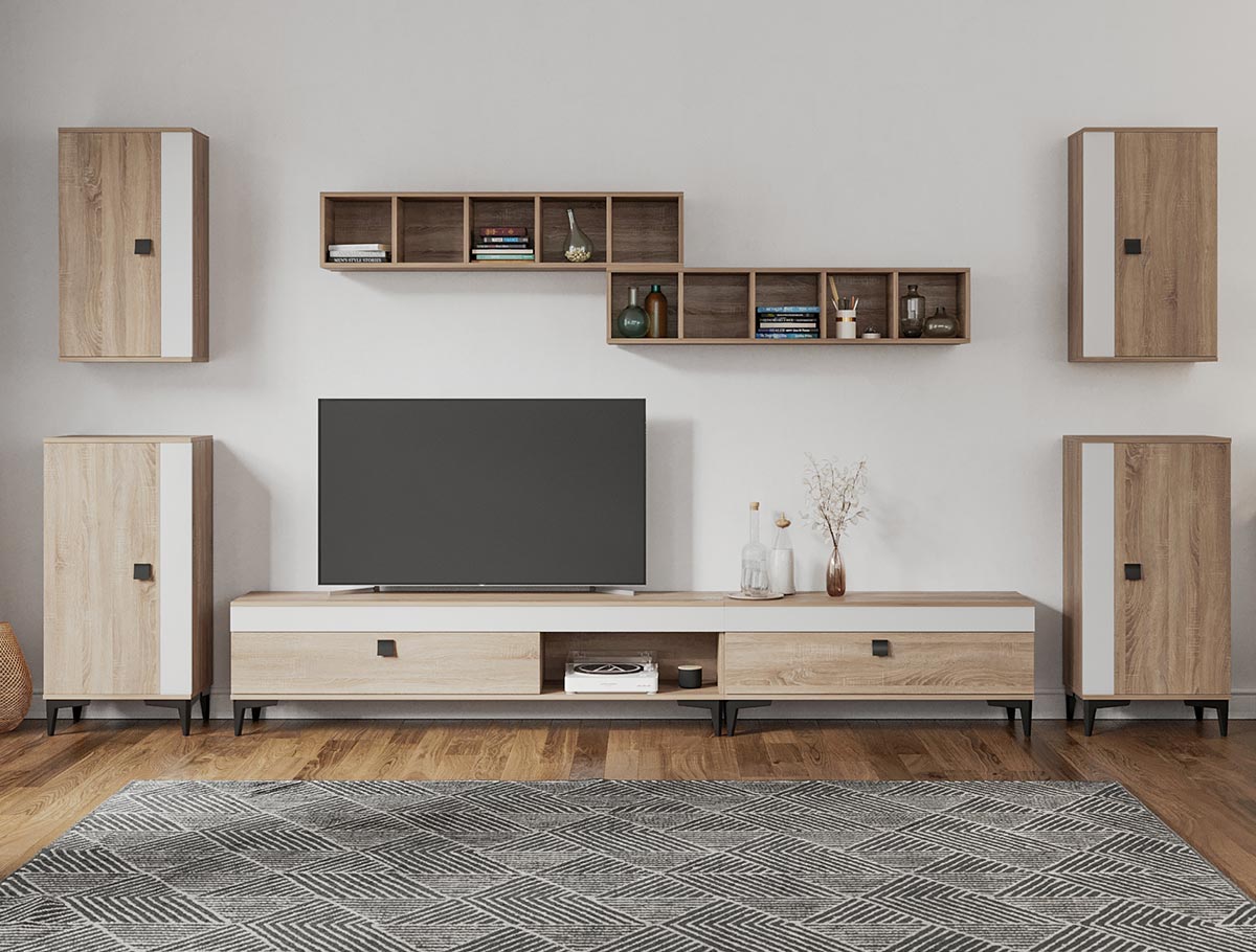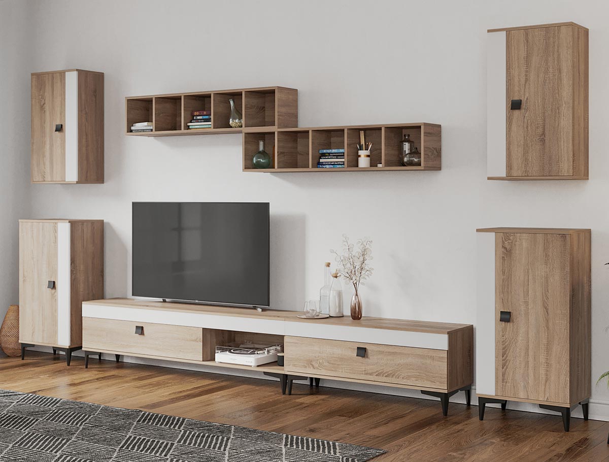 Living Scandinav Rafa 14 Un living in stil scandinav este aerisit, calduros, imbina texturi si materiale diverse si iti da o stare de relaxare, in aceasta categorie de mobilier se incadreza si setul de Living Scandinav Rafa 14. Aceasta colectie are un stil nordic si este alcatuita din mai multe corpuri. Puteti alege direct din configuratiile realizate de noi sau daca doriti puteti creea singuri propria configuratie de living combinand din corpurile de mobila pentru living astfel incat sa se potriveasca perfect in spatiul dorit. Livrare gratuita si rapida, 4-10 zile lucratoare prin flota proprie Suntem producatori de mobilier, fara intermediari Toate piesele de mobilier au o garantie de 2 ani Mobila Sufragerie stil nordic Corpurile sunt construite din PAL melaminat de 16mm cu finisaj alb si sonoma , cel din urma avand o textura similara lemnului, impreuna cu manerele si picioarele negre creeaza un contrast rafinat si un ambient placut. Cantul aplicat este unul de 0,6 ce le permite muchiilor sa fie placute la atingere . Dimensiuni Rafa 14 – Living Scandinav Imaginea alaturata prezinta compartimentarea pentru mobila de sufragerie Rafa. Aceasta configuratie are 8 corpuri modulare , 4 suspendate si 4 pe sol. Spatii de depozitare cu usa cat si etajere si polite. Dimensiuni corpuri componente: Comoda TV 1600: L 160 x A 33.5 x H 43.7 cm Comoda TV 1000 Rafa: L 100 x A 33.5 x H 43.7 cm 2 x Corp decorarativ cu polite: L 120 x A 22 x H 25 cm 2 x Corp Superior Rafa: L 43.9 x A 26.6 x H 77 cm 2 x Corp Inferior Rafa: L 48 x A 33.6 x H 96.8 cm Inaltime picioare 12cm, este inclusa in dimensiunile corpurilor si dimensiunea totala. Dimensiuni totale livin L 370 x A 33.6 x H 185 cm (inaltimea poate varia in functie de inaltimea pentru care optati atunci cand suspendati corpurile superioare) Spatiul de TV: diagonala recomandata maxima 180cm/70″ Toate corpurile se pot pune pe stanga sau pe dreapta in functie de cum doriti. Nu este obligatoriu pozitionarea ca in prezentare. Ele nu sunt prinse unul de celalalt. Info si schite montaj mobila sufragerie DESCARCA SCHITA COMODA TV 1000 DESCARCA SCHITA COMODA TV 1600 DESCARCA SCHITA CORP SUPERIOR DESCARCA SCHITA CORP INFERIOR DESCARCA SCHITA CORP DECORARATIV CU POLITE Atentie! Elementele de prindere de tipul dibluri, surub sau horsurub nu sunt incluse deoarce tipul de prindere difera in functie de tipul peretelui pe care urmeaza a se monta mobilierul (beton, caramida, BCA, rigips, lemn etc). Pretul afisat nu include alte accesorii sau obiecte de decor (TV, tablouri, elemente de iluminat, covor etc.) Dimensiunile sunt exprimate in cm si pot oscila intre ± 10 mm. Produsul se livreaza demontat si este insotit de accesorii si instructiuni de asamblare.