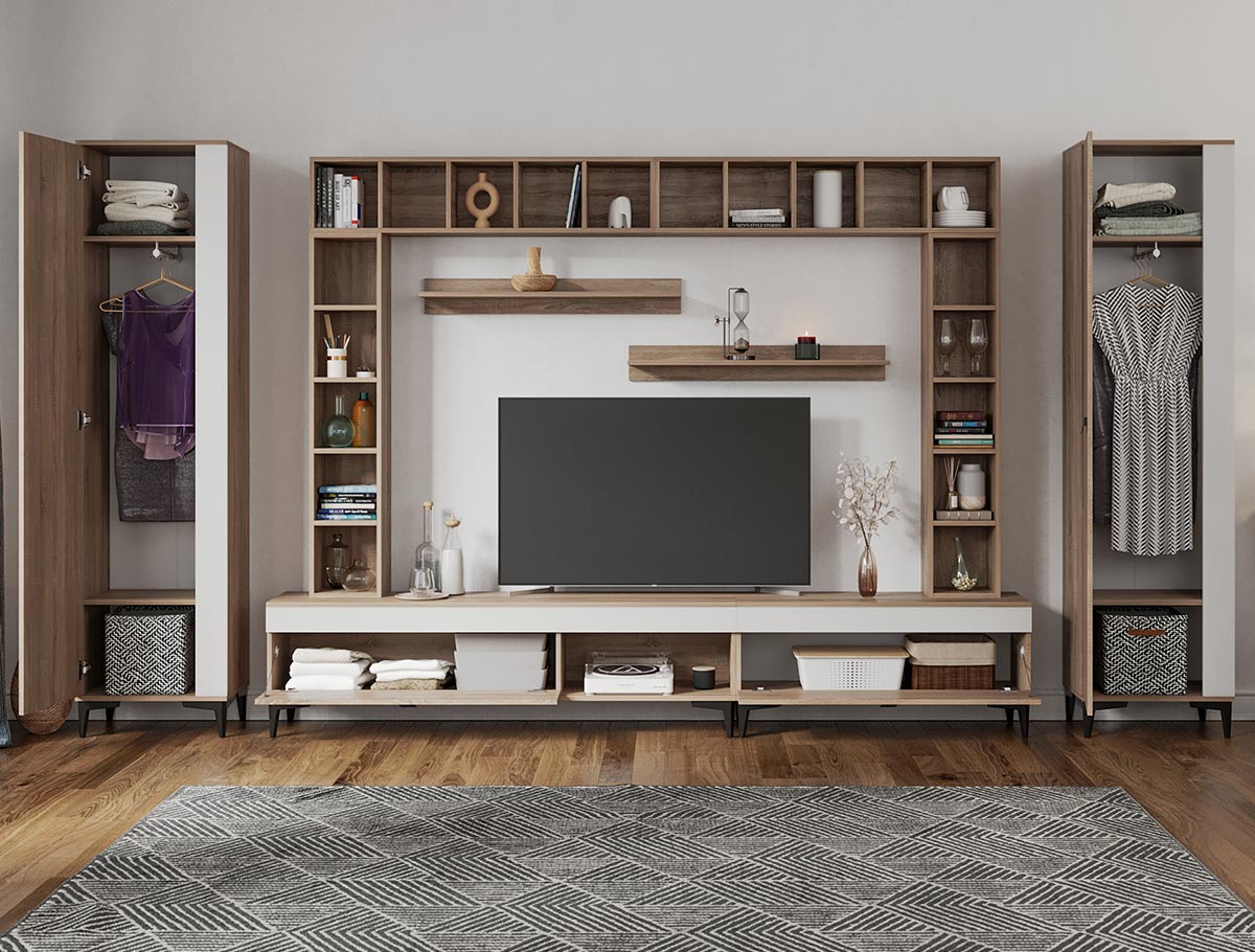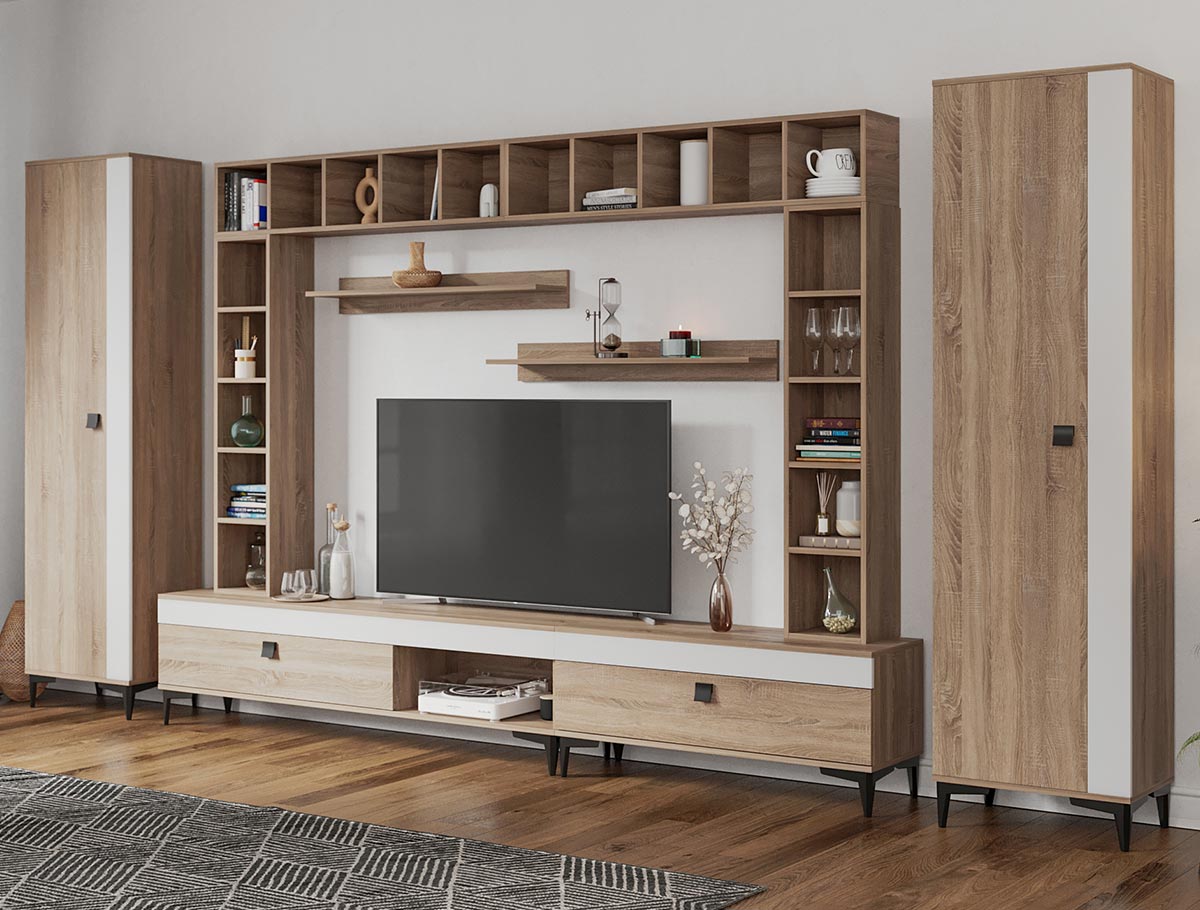 Living Scandinav Rafa 16 Un living in stil scandinav este aerisit, calduros, imbina texturi si materiale diverse si iti da o stare de relaxare, in aceasta categorie de mobilier se incadreza si setul de Living Scandinav Rafa 16. Aceasta colectie are un stil nordic si este alcatuita din mai multe corpuri. Puteti alege direct din configuratiile realizate de noi sau daca doriti puteti creea singuri propria configuratie de living combinand din corpurile de mobila pentru living astfel incat sa se potriveasca perfect in spatiul dorit. Livrare gratuita si rapida, 4-10 zile lucratoare prin flota proprie Suntem producatori de mobilier, fara intermediari Toate piesele de mobilier au o garantie de 2 ani Mobila Sufragerie stil nordic Corpurile sunt construite din PAL melaminat de 16mm cu finisaj alb si sonoma , cel din urma avand o textura similara lemnului, impreuna cu manerele si picioarele negre creeaza un contrast rafinat si un ambient placut. Cantul aplicat este unul de 0,6 ce le permite muchiilor sa fie placute la atingere . Dimensiuni Rafa 16 – Living Scandinav Imaginea alaturata prezinta compartimentarea pentru mobila de sufragerie Rafa. Aceasta configuratie are 10 corpuri modulare , 4 suspendate si 6 nesuspendate. Spatii de depozitare cu usa cat si etajere si polite. Dulapurile au bare de haine. Dimensiuni corpuri componente: Comoda TV 1600: L 160 x A 33.5 x H 43.7 cm Comoda TV 1000: L 100 x A 33.5 x H 43.7 cm 4 x Corp decorarativ cu polite: L 120 x A 22 x H 25 cm Set 2 Polite Suspendate: L 91.8 x A 18.6 x H 12 cm 2 x Dulap de haine: L 51.6 x A 35.1 x H 192.4 cm Inaltime picioare 12cm, este inclusa in dimensiunile corpurilor si dimensiunea totala. Dimensiuni totale livin L 400 x A 35.1 x H 192.4 cm (inaltimea poate varia in functie de inaltimea pentru care optati atunci cand suspendati corpurile superioare) Spatiul de TV: diagonala recomandata maxima 180cm/70″ Toate corpurile se pot pune pe stanga sau pe dreapta in functie de cum doriti. Nu este obligatoriu pozitionarea ca in prezentare. Ele nu sunt prinse unul de celalalt. Info si schite montaj mobila sufragerie DESCARCA SCHITA COMODA TV 1000 DESCARCA SCHITA COMODA TV 1600 DESCARCA SCHITA CORP DECORARATIV CU POLITE DESCARCA SCHITA POLITA DESCARCA SCHITA DULAP HAINE Atentie! Elementele de prindere de tipul dibluri, surub sau horsurub nu sunt incluse deoarce tipul de prindere difera in functie de tipul peretelui pe care urmeaza a se monta mobilierul (beton, caramida, BCA, rigips, lemn etc). Pretul afisat nu include alte accesorii sau obiecte de decor (TV, tablouri, elemente de iluminat, covor etc.) Dimensiunile sunt exprimate in cm si pot oscila intre ± 10 mm. Produsul se livreaza demontat si este insotit de accesorii si instructiuni de asamblare.