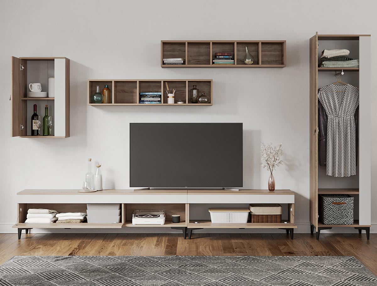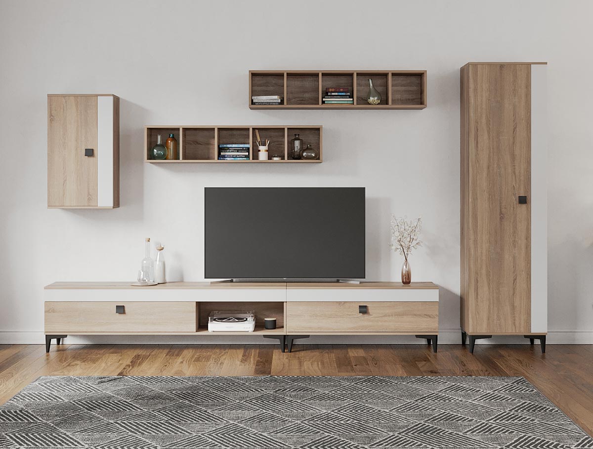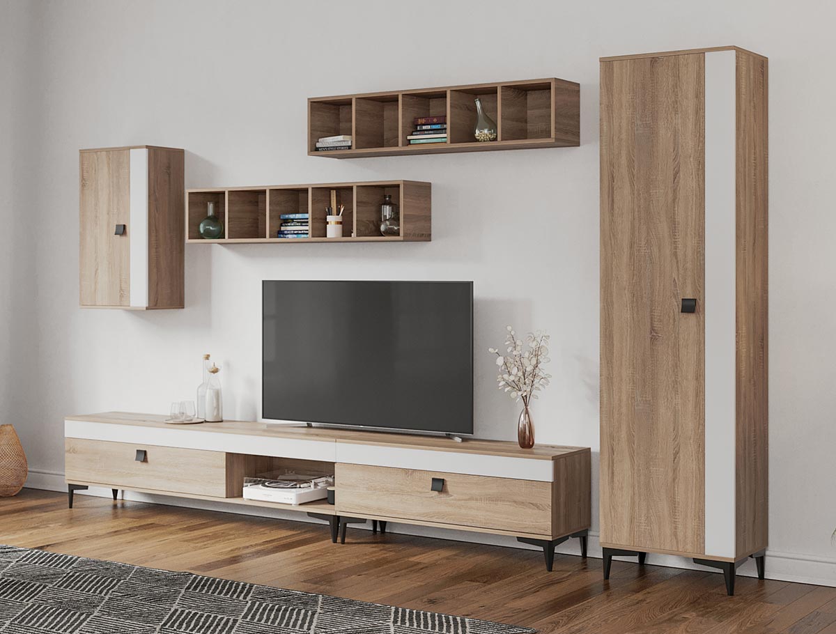Living Scandinav Rafa 18 Un living in stil scandinav este aerisit, calduros, imbina texturi si materiale diverse si iti da o stare de relaxare, in aceasta categorie de mobilier se incadreza si setul de Living Scandinav Rafa 18. Aceasta colectie are un stil nordic si este alcatuita din mai multe corpuri. Puteti alege direct din configuratiile realizate de noi sau daca doriti puteti creea singuri propria configuratie de living combinand din corpurile de mobila pentru living astfel incat sa se potriveasca perfect in spatiul dorit. Livrare gratuita si rapida, 4-10 zile lucratoare prin flota proprie Suntem producatori de mobilier, fara intermediari Toate piesele de mobilier au o garantie de 2 ani Mobila Sufragerie stil nordic Corpurile sunt construite din PAL melaminat de 16mm cu finisaj alb si sonoma , cel din urma avand o textura similara lemnului, impreuna cu manerele si picioarele negre creeaza un contrast rafinat si un ambient placut. Cantul aplicat este unul de 0,6 ce le permite muchiilor sa fie placute la atingere . Dimensiuni Rafa 18 – Living Scandinav Imaginea alaturata prezinta compartimentarea pentru mobila de sufragerie Rafa. Aceasta configuratie are 6 corpuri modulare , 3 suspendate si 3 nesuspendate. Spatii de depozitare cu usa cat si etajere si polite. Dulapul are bara de haine. Dimensiuni corpuri componente: Comoda TV 1600: L 160 x A 33.5 x H 43.7 cm Comoda TV 1000: L 100 x A 33.5 x H 43.7 cm 2 x Corp decorarativ cu polite: L 120 x A 22 x H 25 cm Corp Superior: L 43.9 x A 26.6 x H 77 cm Dulap de haine: L 51.6 x A 35.1 x H 192.4 cm Inaltime picioare 12cm, este inclusa in dimensiunile corpurilor si dimensiunea totala. Dimensiuni totale livin L 320 x A 35.1 x H 192.4 cm (inaltimea poate varia in functie de inaltimea pentru care optati atunci cand suspendati corpurile superioare) Spatiul de TV: diagonala recomandata maxima 180cm/70″ Toate corpurile se pot pune pe stanga sau pe dreapta in functie de cum doriti. Nu este obligatoriu pozitionarea ca in prezentare. Ele nu sunt prinse unul de celalalt. Info si schite montaj mobila sufragerie DESCARCA SCHITA COMODA TV 1000 DESCARCA SCHITA COMODA TV 1600 DESCARCA SCHITA CORP SUPERIOR DESCARCA SCHITA CORP DECORARATIV CU POLITE DESCARCA SCHITA DULAP HAINE Atentie! Elementele de prindere de tipul dibluri, surub sau horsurub nu sunt incluse deoarce tipul de prindere difera in functie de tipul peretelui pe care urmeaza a se monta mobilierul (beton, caramida, BCA, rigips, lemn etc). Pretul afisat nu include alte accesorii sau obiecte de decor (TV, tablouri, elemente de iluminat, covor etc.) Dimensiunile sunt exprimate in cm si pot oscila intre ± 10 mm. Produsul se livreaza demontat si este insotit de accesorii si instructiuni de asamblare.