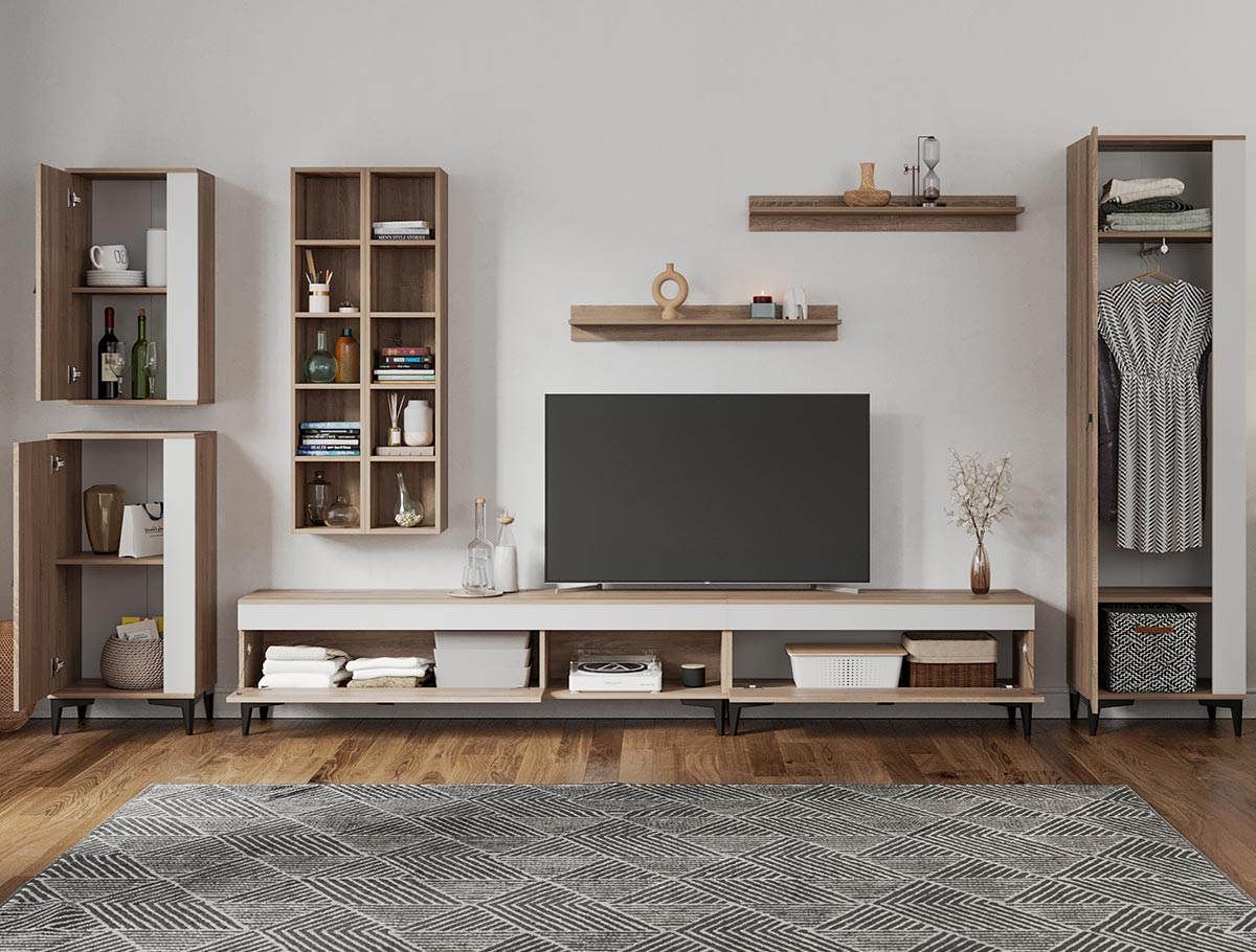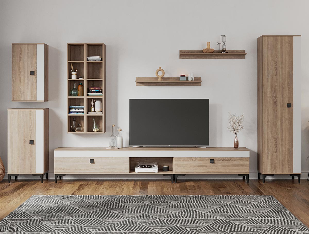 Living Scandinav Rafa 19 Un living in stil scandinav este aerisit, calduros, imbina texturi si materiale diverse si iti da o stare de relaxare, in aceasta categorie de mobilier se incadreza si setul de Living Scandinav Rafa 19. Aceasta colectie are un stil nordic si este alcatuita din mai multe corpuri. Puteti alege direct din configuratiile realizate de noi sau daca doriti puteti creea singuri propria configuratie de living combinand din corpurile de mobila pentru living astfel incat sa se potriveasca perfect in spatiul dorit. Livrare gratuita si rapida, 4-10 zile lucratoare prin flota proprie Suntem producatori de mobilier, fara intermediari Toate piesele de mobilier au o garantie de 2 ani Mobila Sufragerie stil nordic Corpurile sunt construite din PAL melaminat de 16mm cu finisaj alb si sonoma , cel din urma avand o textura similara lemnului, impreuna cu manerele si picioarele negre creeaza un contrast rafinat si un ambient placut. Cantul aplicat este unul de 0,6 ce le permite muchiilor sa fie placute la atingere . Dimensiuni Rafa 19 – Living Scandinav Imaginea alaturata prezinta compartimentarea pentru mobila de sufragerie Rafa. Aceasta configuratie are 9 corpuri modulare , 5 suspendate si 4 nesuspendate. Spatii de depozitare cu usa cat si etajere si polite. Dulapul are bara de haine. Dimensiuni corpuri componente: Comoda TV 1600: L 160 x A 33.5 x H 43.7 cm Comoda TV 1000: L 100 x A 33.5 x H 43.7 cm 2 x Corp decorarativ cu polite: L 120 x A 22 x H 25 cm Corp Superior: L 43.9 x A 26.6 x H 77 cm Corp Inferior: L 48 x A 33.6 x H 96.8 cm Set 2 Polite Suspendate: L 91.8 x A 18.6 x H 12 cm Dulap de haine: L 51.6 x A 35.1 x H 192.4 cm Inaltime picioare 12cm, este inclusa in dimensiunile corpurilor si dimensiunea totala. Dimensiuni totale livin L 390 x A 35.1 x H 192.4 cm (inaltimea poate varia in functie de inaltimea pentru care optati atunci cand suspendati corpurile superioare) Spatiul de TV: diagonala recomandata maxima 180cm/70″ Toate corpurile se pot pune pe stanga sau pe dreapta in functie de cum doriti. Nu este obligatoriu pozitionarea ca in prezentare. Ele nu sunt prinse unul de celalalt. Info si schite montaj mobila sufragerie DESCARCA SCHITA COMODA TV 1000 DESCARCA SCHITA COMODA TV 1600 DESCARCA SCHITA CORP SUPERIOR DESCARCA SCHITA CORP INFERIOR DESCARCA SCHITA CORP DECORARATIV CU POLITE DESCARCA SCHITA POLITA DESCARCA SCHITA DULAP HAINE Atentie! Elementele de prindere de tipul dibluri, surub sau horsurub nu sunt incluse deoarce tipul de prindere difera in functie de tipul peretelui pe care urmeaza a se monta mobilierul (beton, caramida, BCA, rigips, lemn etc). Pretul afisat nu include alte accesorii sau obiecte de decor (TV, tablouri, elemente de iluminat, covor etc.) Dimensiunile sunt exprimate in cm si pot oscila intre ± 10 mm. Produsul se livreaza demontat si este insotit de accesorii si instructiuni de asamblare.