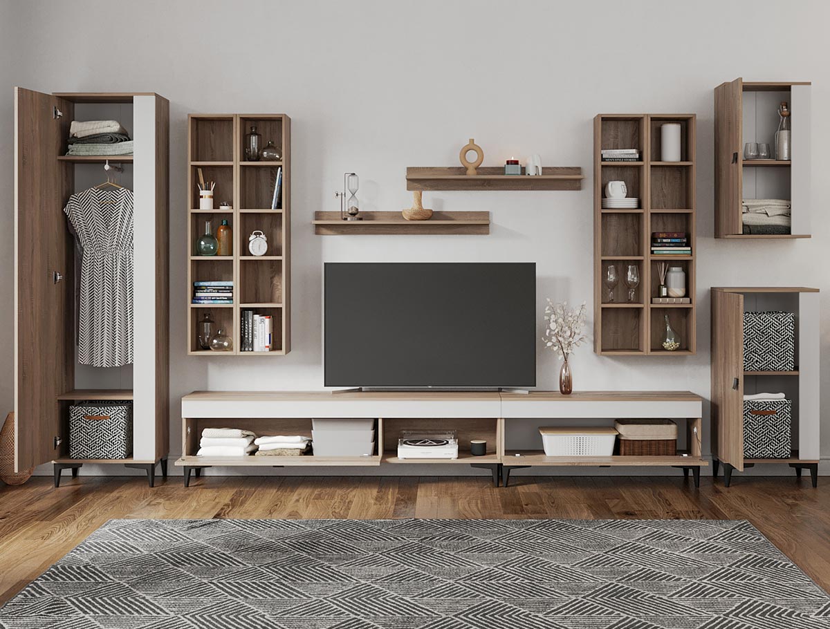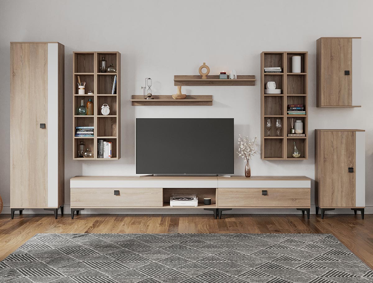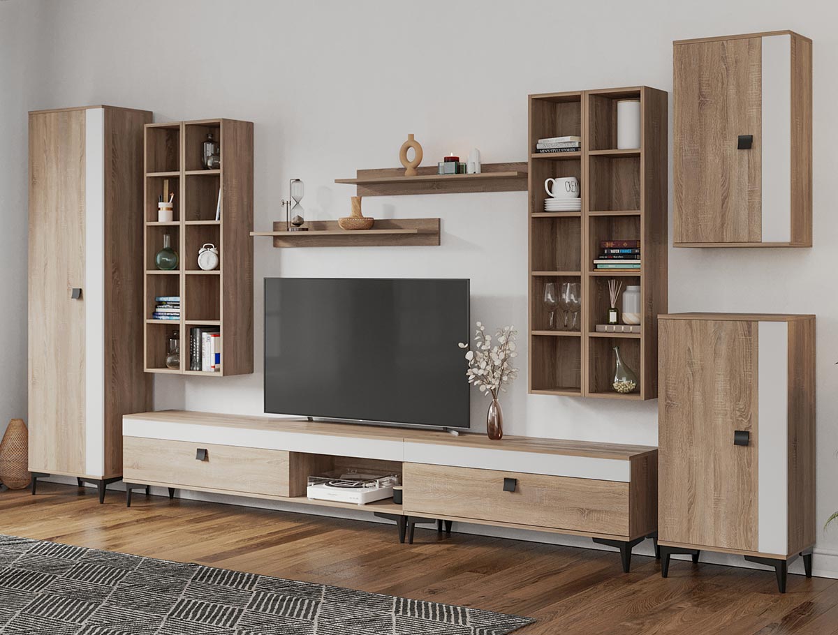Living Scandinav Rafa 20 Un living in stil scandinav este aerisit, calduros, imbina texturi si materiale diverse si iti da o stare de relaxare, in aceasta categorie de mobilier se incadreza si setul de Living Scandinav Rafa 20. Aceasta colectie are un stil nordic si este alcatuita din mai multe corpuri. Puteti alege direct din configuratiile realizate de noi sau daca doriti puteti creea singuri propria configuratie de living combinand din corpurile de mobila pentru living astfel incat sa se potriveasca perfect in spatiul dorit. Livrare gratuita si rapida, 4-10 zile lucratoare prin flota proprie Suntem producatori de mobilier, fara intermediari Toate piesele de mobilier au o garantie de 2 ani Mobila Sufragerie stil nordic Corpurile sunt construite din PAL melaminat de 16mm cu finisaj alb si sonoma , cel din urma avand o textura similara lemnului, impreuna cu manerele si picioarele negre creeaza un contrast rafinat si un ambient placut. Cantul aplicat este unul de 0,6 ce le permite muchiilor sa fie placute la atingere . Dimensiuni Rafa 20 – Living Scandinav Imaginea alaturata prezinta compartimentarea pentru mobila de sufragerie Rafa. Aceasta configuratie are 11 corpuri modulare , 7 suspendate si 4 nesuspendate. Spatii de depozitare cu usa cat si etajere si polite. Dulapul are bara de haine. Dimensiuni corpuri componente: Comoda TV 1600: L 160 x A 33.5 x H 43.7 cm Comoda TV 1000: L 100 x A 33.5 x H 43.7 cm 4 x Corp decorarativ cu polite: L 120 x A 22 x H 25 cm Corp Superior: L 43.9 x A 26.6 x H 77 cm Corp Inferior: L 48 x A 33.6 x H 96.8 cm Set 2 Polite Suspendate: L 91.8 x A 18.6 x H 12 cm Dulap de haine: L 51.6 x A 35.1 x H 192.4 cm Inaltime picioare 12cm, este inclusa in dimensiunile corpurilor si dimensiunea totala. Dimensiuni totale livin L 390 x A 35.1 x H 185 cm (inaltimea poate varia in functie de inaltimea pentru care optati atunci cand suspendati corpurile superioare) Spatiul de TV: diagonala recomandata maxima 180cm/70″ Toate corpurile se pot pune pe stanga sau pe dreapta in functie de cum doriti. Nu este obligatoriu pozitionarea ca in prezentare. Ele nu sunt prinse unul de celalalt. Info si schite montaj mobila sufragerie DESCARCA SCHITA COMODA TV 1000 DESCARCA SCHITA COMODA TV 1600 DESCARCA SCHITA CORP SUPERIOR DESCARCA SCHITA CORP INFERIOR DESCARCA SCHITA CORP DECORARATIV CU POLITE DESCARCA SCHITA POLITA DESCARCA SCHITA DULAP HAINE Atentie! Elementele de prindere de tipul dibluri, surub sau horsurub nu sunt incluse deoarce tipul de prindere difera in functie de tipul peretelui pe care urmeaza a se monta mobilierul (beton, caramida, BCA, rigips, lemn etc). Pretul afisat nu include alte accesorii sau obiecte de decor (TV, tablouri, elemente de iluminat, covor etc.) Dimensiunile sunt exprimate in cm si pot oscila intre ± 10 mm. Produsul se livreaza demontat si este insotit de accesorii si instructiuni de asamblare.