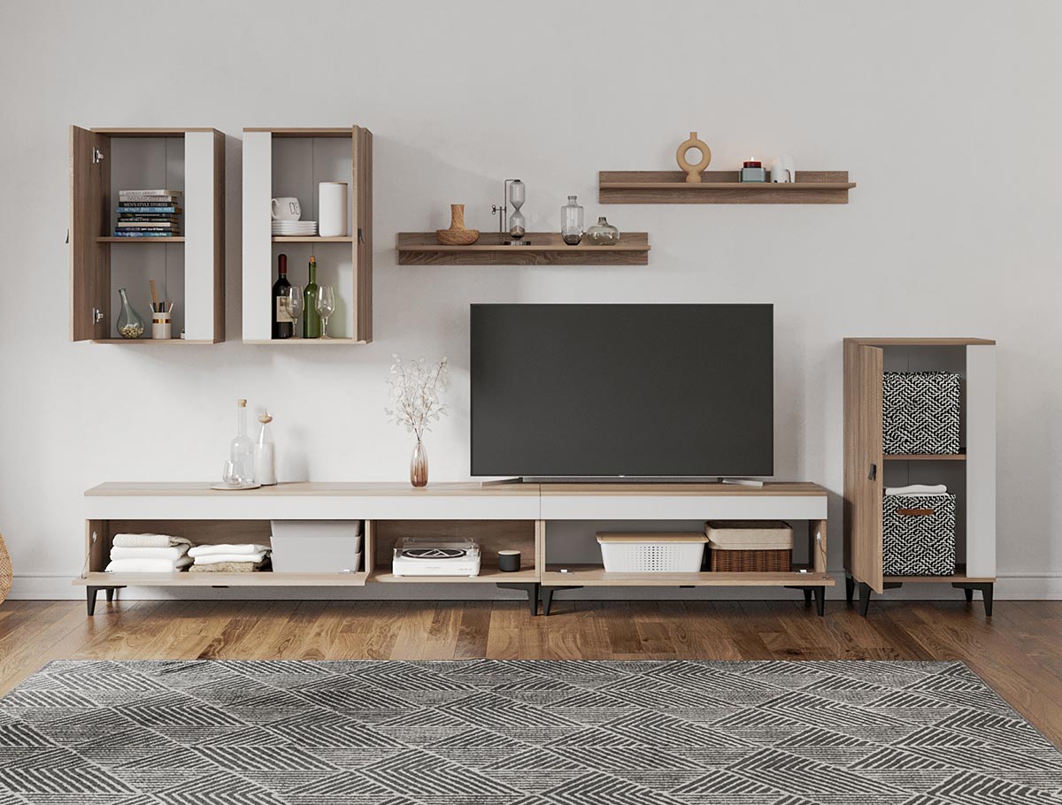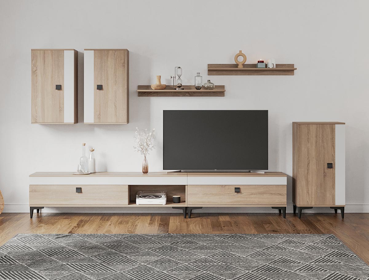 Living Scandinav Rafa 22 Un living in stil scandinav este aerisit, calduros, imbina texturi si materiale diverse si iti da o stare de relaxare, in aceasta categorie de mobilier se incadreza si setul de Living Scandinav Rafa 22. Aceasta colectie are un stil nordic si este alcatuita din mai multe corpuri. Puteti alege direct din configuratiile realizate de noi sau daca doriti puteti creea singuri propria configuratie de living combinand din corpurile de mobila pentru living astfel incat sa se potriveasca perfect in spatiul dorit. Livrare gratuita si rapida, 4-10 zile lucratoare prin flota proprie Suntem producatori de mobilier, fara intermediari Toate piesele de mobilier au o garantie de 2 ani Mobila Sufragerie stil nordic Corpurile sunt construite din PAL melaminat de 16mm cu finisaj alb si sonoma , cel din urma avand o textura similara lemnului, impreuna cu manerele si picioarele negre creeaza un contrast rafinat si un ambient placut. Cantul aplicat este unul de 0,6 ce le permite muchiilor sa fie placute la atingere . Dimensiuni Rafa 22 – Living Scandinav Imaginea alaturata prezinta compartimentarea pentru mobila de sufragerie Rafa. Aceasta configuratie are 7 corpuri modulare , 4 suspendate si 3 pe sol. Spatii de depozitare cu usa cat si etajere si polite. Dimensiuni corpuri componente: Comoda TV 1000: L 100 x A 33.5 x H 43.7 cm Comoda TV 1600: L 160 x A 33.5 x H 43.7 cm 2 x Corp Superior: L 43.9 x A 26.6 x H 77 cm Corp Inferior: L 48 x A 33.6 x H 96.8 cm Set 2 Polite Suspendate: L 91.8 x A 18.6 x H 12 cm Inaltime picioare 12cm, este inclusa in dimensiunile corpurilor si dimensiunea totala. Dimensiuni totale livin L 320 x A 33.6 x H 185 cm (inaltimea poate varia in functie de inaltimea pentru care optati atunci cand suspendati corpurile superioare) Spatiul de TV: diagonala recomandata maxima 180cm/70″ Toate corpurile se pot pune pe stanga sau pe dreapta in functie de cum doriti. Nu este obligatoriu pozitionarea ca in prezentare. Ele nu sunt prinse unul de celalalt. Info si schite montaj mobila sufragerie DESCARCA SCHITA COMODA TV 1600 DESCARCA SCHITA COMODA TV 1000 DESCARCA SCHITA CORP SUPERIOR DESCARCA SCHITA CORP INFERIOR DESCARCA SCHITA POLITA Atentie! Elementele de prindere de tipul dibluri, surub sau horsurub nu sunt incluse deoarce tipul de prindere difera in functie de tipul peretelui pe care urmeaza a se monta mobilierul (beton, caramida, BCA, rigips, lemn etc). Pretul afisat nu include alte accesorii sau obiecte de decor (TV, tablouri, elemente de iluminat, covor etc.) Dimensiunile sunt exprimate in cm si pot oscila intre ± 10 mm. Produsul se livreaza demontat si este insotit de accesorii si instructiuni de asamblare.