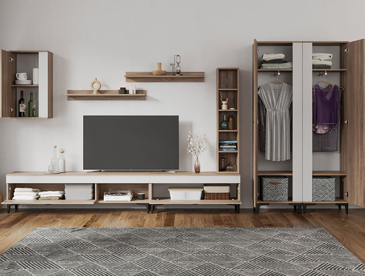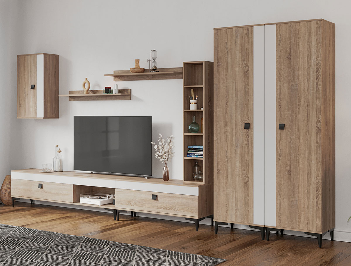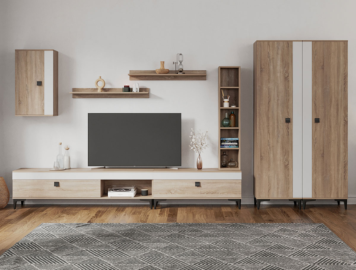 Living Scandinav Rafa 25 Un living in stil scandinav este aerisit, calduros, imbina texturi si materiale diverse si iti da o stare de relaxare, in aceasta categorie de mobilier se incadreza si setul de Living Scandinav Rafa 25. Aceasta colectie are un stil nordic si este alcatuita din mai multe corpuri. Puteti alege direct din configuratiile realizate de noi sau daca doriti puteti creea singuri propria configuratie de living combinand din corpurile de mobila pentru living astfel incat sa se potriveasca perfect in spatiul dorit. Livrare gratuita si rapida, 4-10 zile lucratoare prin flota proprie Suntem producatori de mobilier, fara intermediari Toate piesele de mobilier au o garantie de 2 ani Mobila Sufragerie stil nordic Corpurile sunt construite din PAL melaminat de 16mm cu finisaj alb si sonoma , cel din urma avand o textura similara lemnului, impreuna cu manerele si picioarele negre creeaza un contrast rafinat si un ambient placut. Cantul aplicat este unul de 0,6 ce le permite muchiilor sa fie placute la atingere . Dimensiuni Rafa 25 – Living Scandinav Imaginea alaturata prezinta compartimentarea pentru mobila de sufragerie Rafa. Aceasta configuratie are 8 corpuri modulare , 3 suspendate si 5 nesuspendate. Spatii de depozitare cu usa cat si etajere si polite. Dulapurile au bara de haine si etajere. Dimensiuni corpuri componente: Comoda TV 1600: L 160 x A 33.5 x H 43.7 cm Comoda TV 1000: L 100 x A 33.5 x H 43.7 cm Corp decorarativ cu polite: L 120 x A 22 x H 25 cm Corp Superior: L 43.9 x A 26.6 x H 77 cm Set 2 Polite Suspendate: L 91.8 x A 18.6 x H 12 cm 2 x Dulap de haine: L 51.6 x A 35.1 x H 192.4 cm Inaltime picioare 12cm, este inclusa in dimensiunile corpurilor si dimensiunea totala. Dimensiuni totale livin L 390 x A 35.1 x H 192.4 cm (inaltimea poate varia in functie de inaltimea pentru care optati atunci cand suspendati corpurile superioare) Spatiul de TV: diagonala recomandata maxima 180cm/70″ Toate corpurile se pot pune pe stanga sau pe dreapta in functie de cum doriti. Nu este obligatoriu pozitionarea ca in prezentare. Ele nu sunt prinse unul de celalalt. Info si schite montaj mobila sufragerie DESCARCA SCHITA COMODA TV 1000 DESCARCA SCHITA COMODA TV 1600 DESCARCA SCHITA CORP SUPERIOR DESCARCA SCHITA CORP DECORARATIV CU POLITE DESCARCA SCHITA POLITA DESCARCA SCHITA DULAP HAINE Atentie! Elementele de prindere de tipul dibluri, surub sau horsurub nu sunt incluse deoarce tipul de prindere difera in functie de tipul peretelui pe care urmeaza a se monta mobilierul (beton, caramida, BCA, rigips, lemn etc). Pretul afisat nu include alte accesorii sau obiecte de decor (TV, tablouri, elemente de iluminat, covor etc.) Dimensiunile sunt exprimate in cm si pot oscila intre ± 10 mm. Produsul se livreaza demontat si este insotit de accesorii si instructiuni de asamblare.