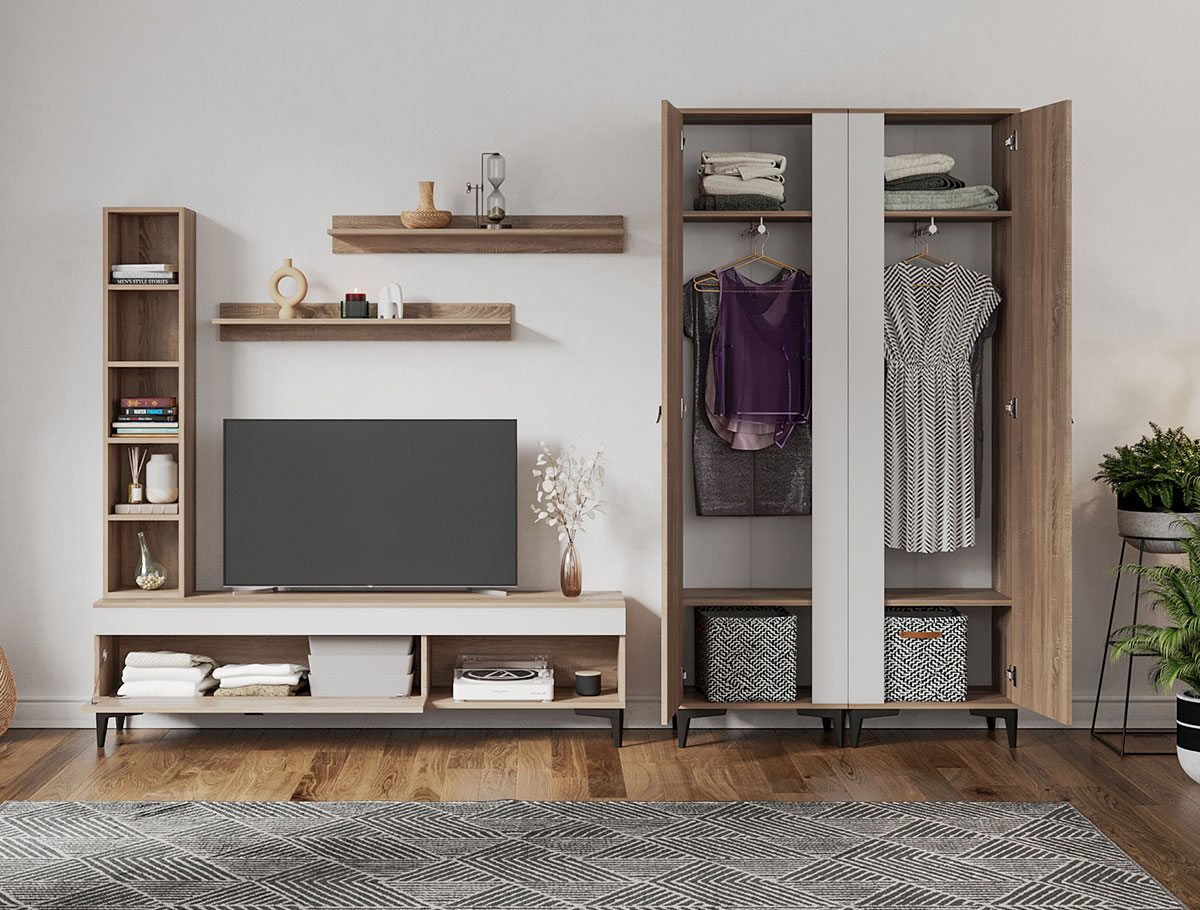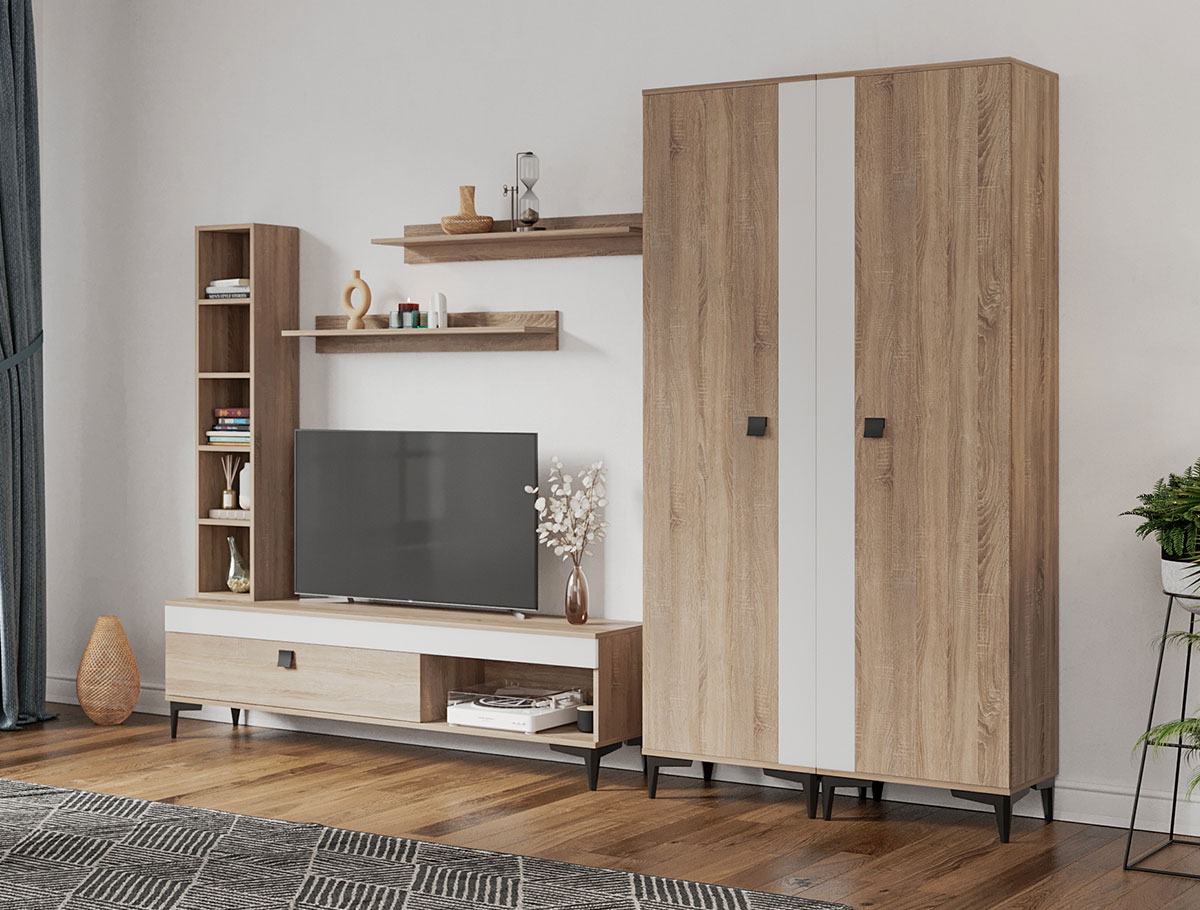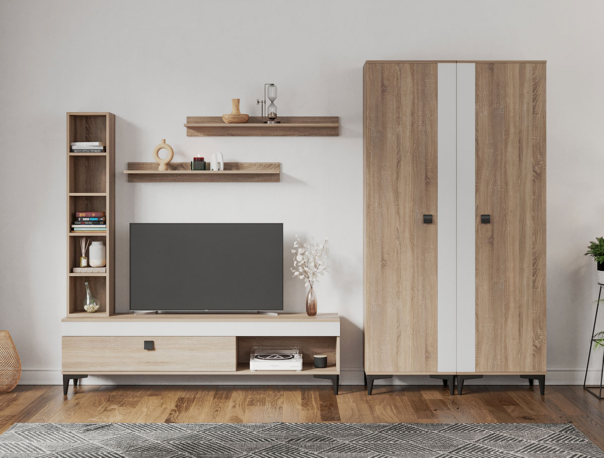 Living Scandinav Rafa 27 Un living in stil scandinav este aerisit, calduros, imbina texturi si materiale diverse si iti da o stare de relaxare, in aceasta categorie de mobilier se incadreza si setul de Living Scandinav Rafa 27. Aceasta colectie are un stil nordic si este alcatuita din mai multe corpuri. Puteti alege direct din configuratiile realizate de noi sau daca doriti puteti creea singuri propria configuratie de living combinand din corpurile de mobila pentru living astfel incat sa se potriveasca perfect in spatiul dorit. Livrare gratuita si rapida, 4-10 zile lucratoare prin flota proprie Suntem producatori de mobilier, fara intermediari Toate piesele de mobilier au o garantie de 2 ani Mobila Sufragerie stil nordic Corpurile sunt construite din PAL melaminat de 16mm cu finisaj alb si sonoma , cel din urma avand o textura similara lemnului, impreuna cu manerele si picioarele negre creeaza un contrast rafinat si un ambient placut. Cantul aplicat este unul de 0,6 ce le permite muchiilor sa fie placute la atingere . Dimensiuni Rafa 27 – Living Scandinav Imaginea alaturata prezinta compartimentarea pentru mobila de sufragerie Rafa. Aceasta configuratie are 6 corpuri modulare , 3 suspendate si 3 nesuspendate. Spatii de depozitare cu usa cat si etajere si polite. Dulapurile au bara de haine si etajere. Dimensiuni corpuri componente: Comoda TV 1600: L 160 x A 33.5 x H 43.7 cm Corp decorarativ cu polite: L 120 x A 22 x H 25 cm Set 2 Polite Suspendate: L 91.8 x A 18.6 x H 12 cm 2 x Dulap de haine: L 51.6 x A 35.1 x H 192.4 cm Inaltime picioare 12cm, este inclusa in dimensiunile corpurilor si dimensiunea totala. Dimensiuni totale livin L 280 x A 35.1 x H 192.4 cm (inaltimea poate varia in functie de inaltimea pentru care optati atunci cand suspendati corpurile superioare) Spatiul de TV: diagonala recomandata maxima 180cm/70″ Toate corpurile se pot pune pe stanga sau pe dreapta in functie de cum doriti. Nu este obligatoriu pozitionarea ca in prezentare. Ele nu sunt prinse unul de celalalt. Info si schite montaj mobila sufragerie DESCARCA SCHITA COMODA TV 1600 DESCARCA SCHITA CORP DECORARATIV CU POLITE DESCARCA SCHITA POLITA DESCARCA SCHITA DULAP HAINE Atentie! Elementele de prindere de tipul dibluri, surub sau horsurub nu sunt incluse deoarce tipul de prindere difera in functie de tipul peretelui pe care urmeaza a se monta mobilierul (beton, caramida, BCA, rigips, lemn etc). Pretul afisat nu include alte accesorii sau obiecte de decor (TV, tablouri, elemente de iluminat, covor etc.) Dimensiunile sunt exprimate in cm si pot oscila intre ± 10 mm. Produsul se livreaza demontat si este insotit de accesorii si instructiuni de asamblare.