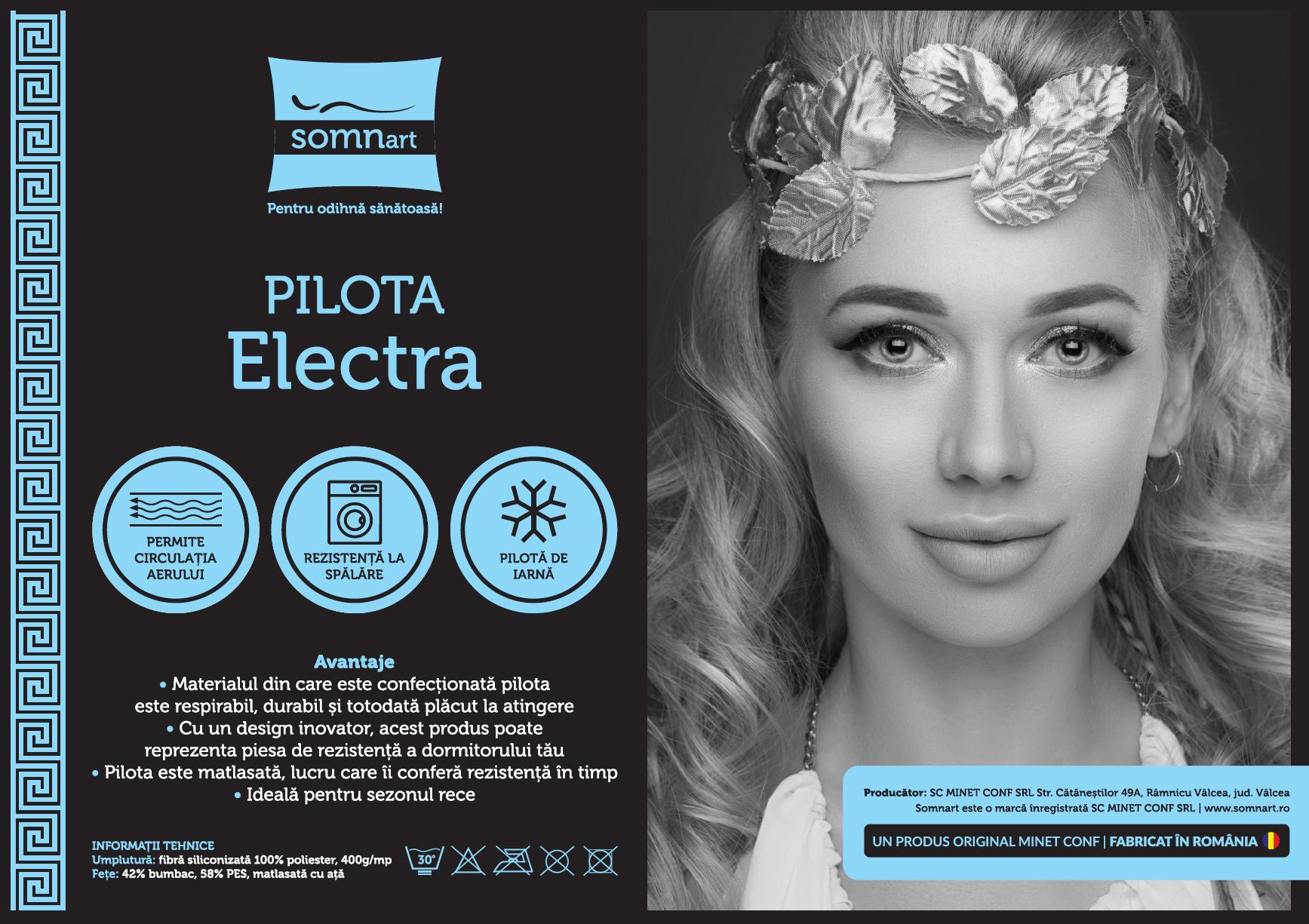 Pilota de iarna Somnart Electra, sezon rece, 400 gr/mp, 150×200 cm Pilotele colorate poarta numele zeitelor grecesti Afrodita, Caliope, Electra, Artemis, Armonia, Selena si Iris. Aceste pilote au fetele confectionate din 42% bumbac si 58% poliester, sunt matlasate cu un model imbietor si umplute cu fibra siliconizata cu gramajul de 400g/mp, fiind ideale pentru sezonul rece. Daca simtiti ca dormitorul vostru nu este complet, una dintre aceste frumoase pilote poate reprezenta piesa de rezistenta a camerei din punct de vedere al design-ului si al confortului. Alege si tu imbratisarea calda a unei zeite si transforma-ti dormitorul intr-un sanctuar divin! Foarte placuta la atingere oferindu-ti astfel un plus de confort Produse certificate pentru absenta substantelor periculoase conform standardului OEKO-TEX 100 Pretabila pentru camerele reci, ideal pentru iarna Dimensiune: 150×200 cm, de o persoana Informatii tehnice produs Material umplutura: Poliester 100%, 400 g/mp Fete: tesatura imprimata, compozitie 42% bumbac si 58% poliester Produs fabricat in Romania Recomandari de utilizare Se recomanda aerisirea pilotei timp de cateva ore dupa ce a fost scoasa din ambalaj. Pentru a pastra produsul curat urmeaza instructiunile de spalare. Recomandam expunerea saptamanala a produselor Somnart la aer curat Aspiratorul nu se foloseste pentru a curata pilotele, exista riscul ca acestea sa se deterioreze. Nu recomandam folosirea sau depozitarea produselor Somnart in spatii umede Lavabila la 40 de grade Somnart®: Pentru odihna sanatoasa! Produsele noastre se regasesc in casele a milioane de romani. Stim ca increderea aratata de clientii nostri se obtine doar prin calitate fara compromis. De aceea produsele noastre sunt realizate in conditii de calitate, mediu, sanatate si securitate ocupationala, la cele mai ridicate standarde europene. Certificari : ISO 9001, ISO 14001, OHSAS 18001. Produse certificate pentru absenta substantelor periculoase conform standardului OEKO-TEX 100
