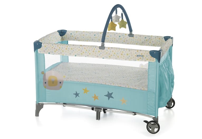 Patut pliabil cu roti cu doua nivele si cordelina de jucarii.
