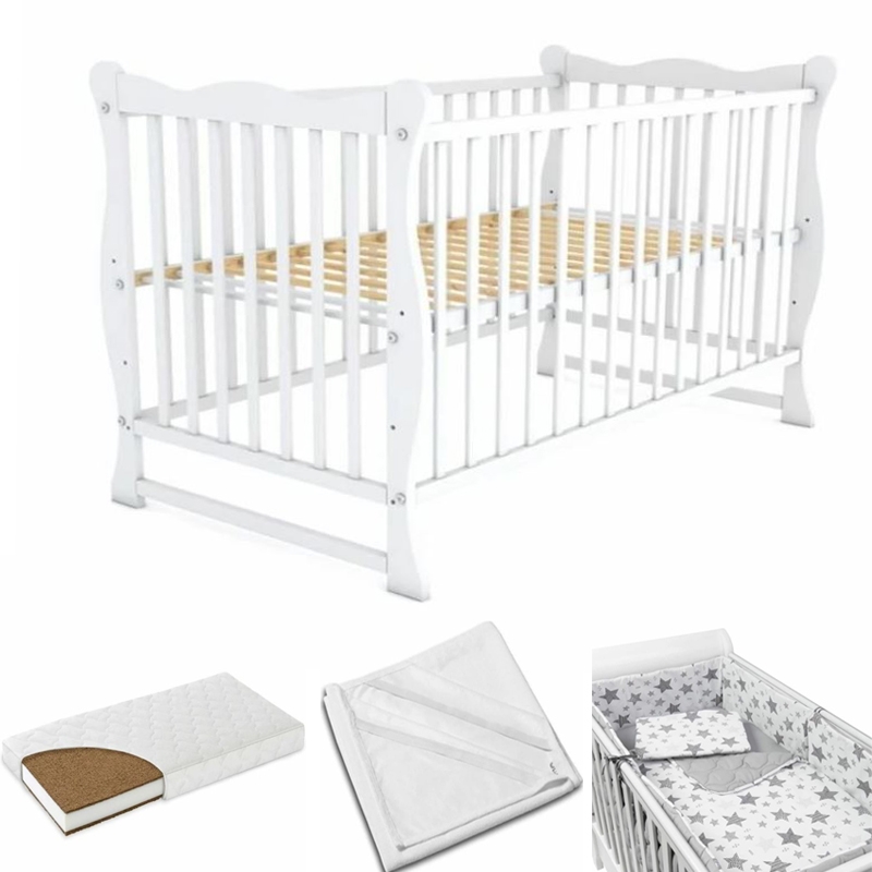 Patut din lemn masiv 120×60 cm Isla alb, include saltea cocos 8 cm, protectie impermeabila si set lenjerie matlasata 5 piese Kidizi