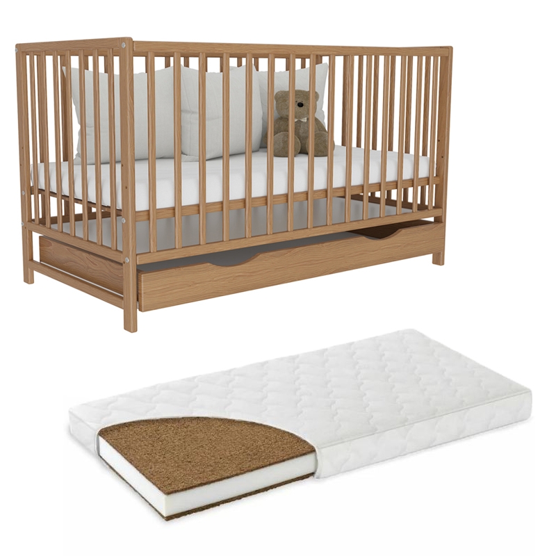 Patut din lemn masiv 120×60 cm Matilda cu sertar stejar auriu si saltea 12 cm