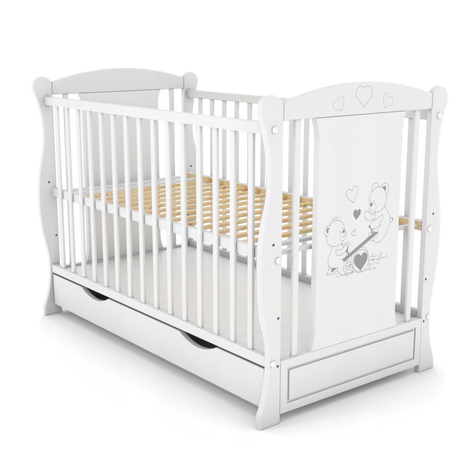 Somiera patutului poate fi reglata pe trei nivele in functie de nevoi. Fabricat din lemn masiv de pin si vopsit cu lac ecologic. Prevazut cu sertar si bariera de pat ce permite tranformarea patutului in canapea si patut junior.