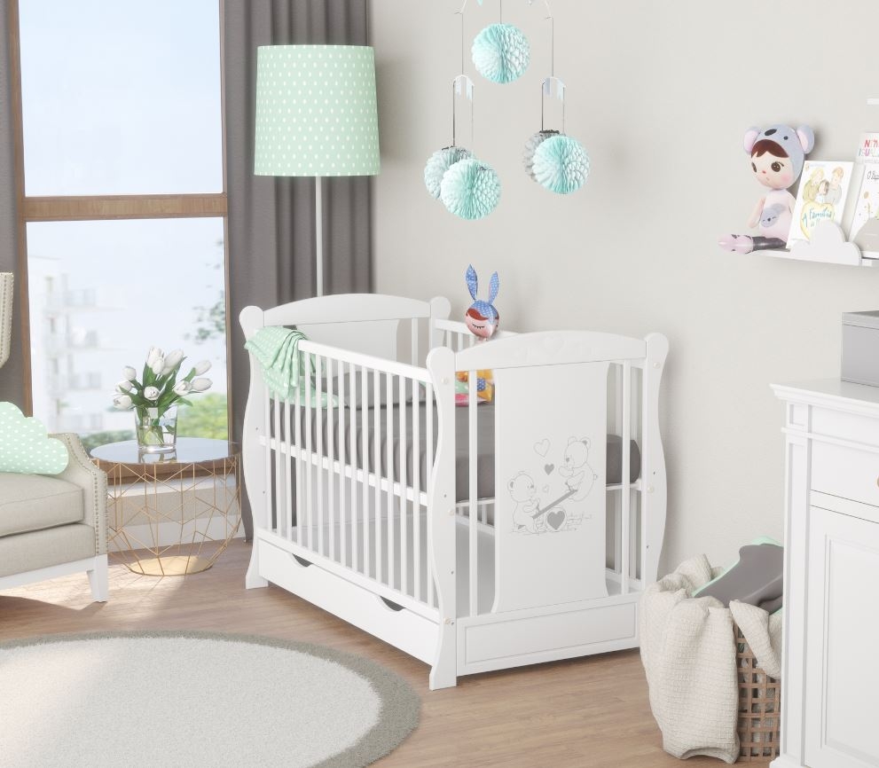 Patut din lemn masiv 2 in 1 Maya alb cu sertar si saltea 8 cm