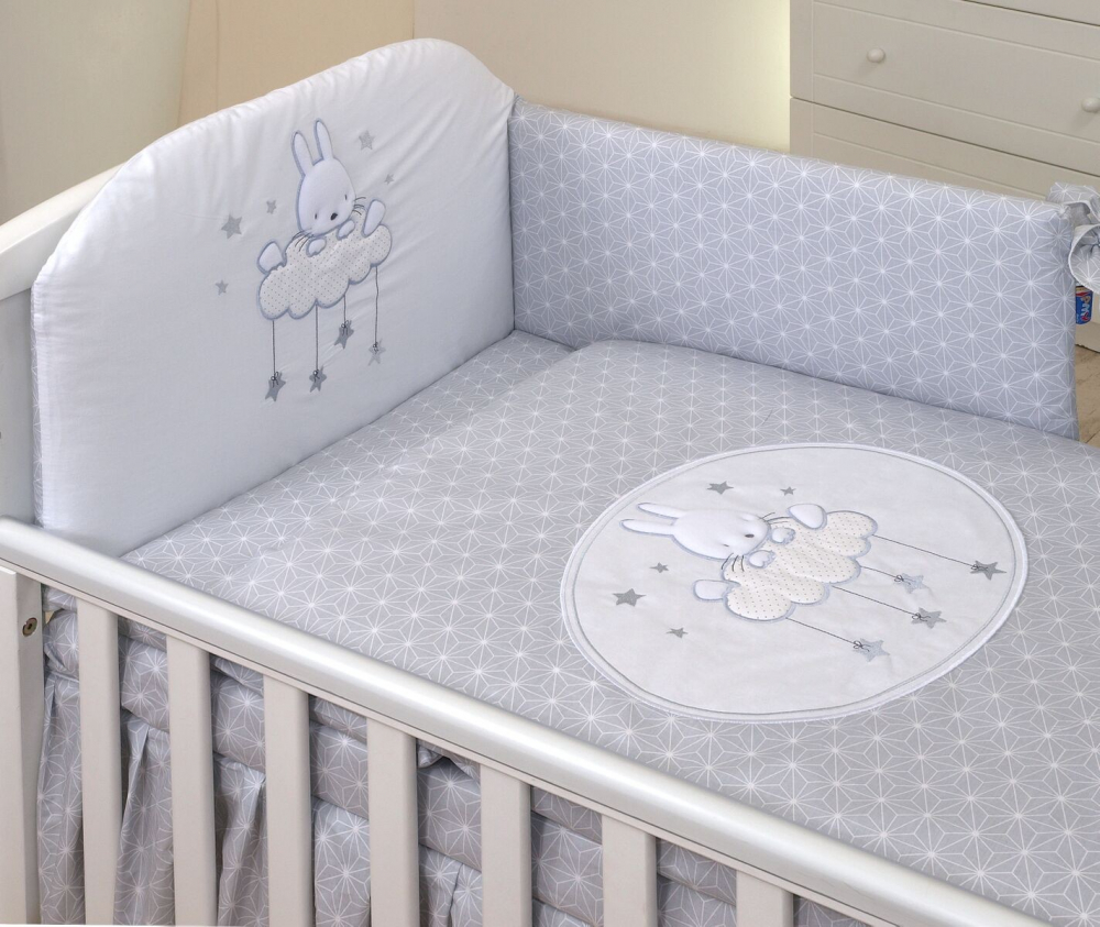 Set lenjerie din bumbac cu protectie laterala pentru pat bebelusi Sky Bunny Grey 120 x 60 cm