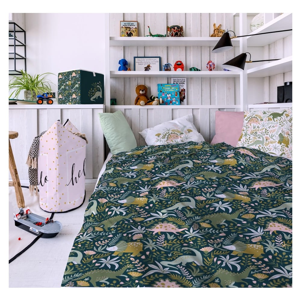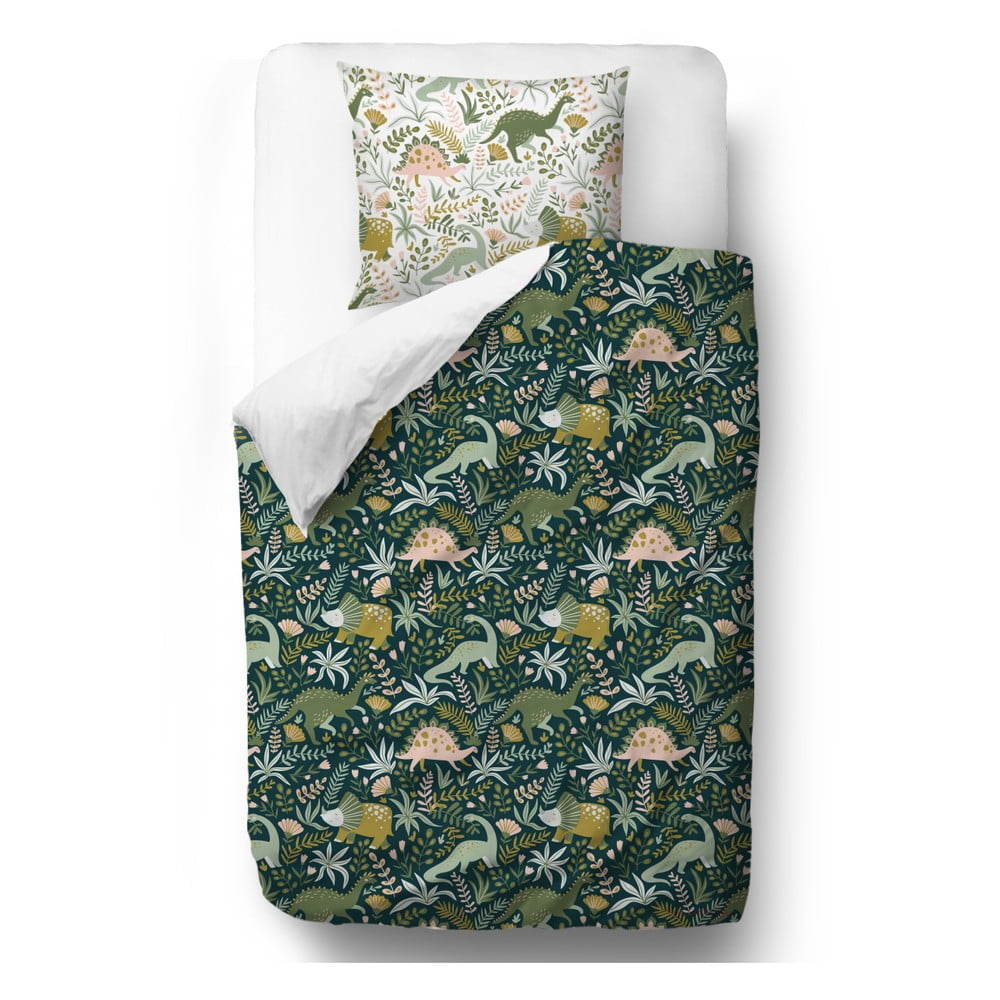 Lenjerie de pat din bumbac satinat Butter Kings Friendly Dinosaurus, 140 x 200 cm, verde închis