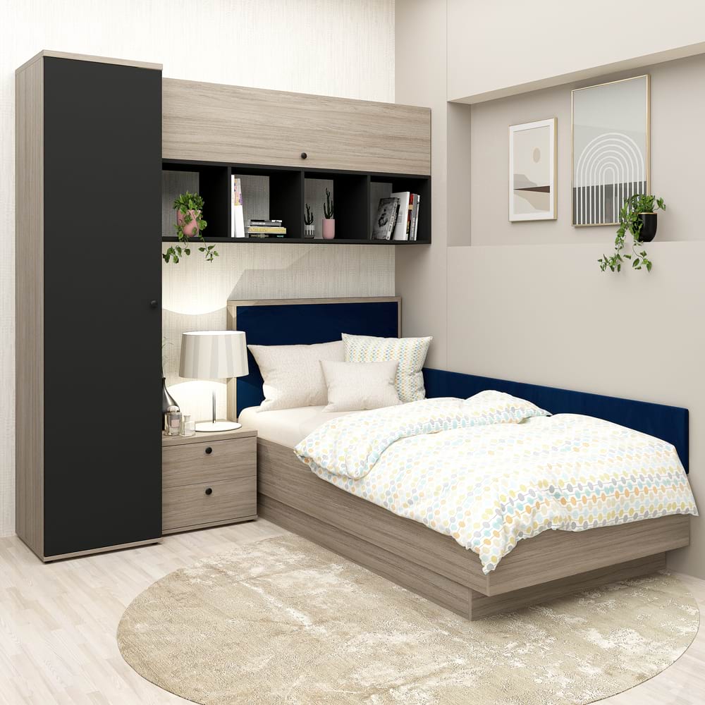 <p>Dormitorul de copii pe colt RIALTO 2, dimensiune pat 90×200, in decorurile Oak, Antracit cu elemente tapitate cu Catifea Albastra face parte din Colectia Primavera. </p><p>Aceasta configuratie cu pat incadrat de dulapuri atat in lateral cat si deasupra este foarte des utilizata in amenajarea camerelor de copii sau adolescenti.</p><p>Configuratia RIALTO 2 se poate completa cu elemente de mobilier in acelasi decor si stil din Colectia Primavera.</p><p><b><img src="https://www2.tamos.ro/images/companies/1/Icons%20TAMOS/untitled%20folder/Produs%20configurabil%2050%20opt.png?1654683836250" style="cursor: pointer;"> <span style="color: rgb(36, 64, 97);">Avantaje</span></b></p><ul><li>configurezi materialele</li><li>configurezi dimensiune pat</li><li>configurezi dimensiune dulap</li><li>configurezi butoni/manere</li><li>configurezi complemente</li><li>mobilier kit, se livreaza demontat, ambalat in cutii de carton</li><li>fiecare componenta a dormitorului este ambalata individual, evitandu-se confuzia la asamblare</li><li>tablia patului este inobilata cu panouri tapitate cu catifea Albastra</li><li>colturile patului sunt retrase in interior pentru evitarea accidentarilor</li><li>rama superioara tapitata cu catifea Albastra – OPTIUNE</li><li>Kit laterale tapitate pat (din 2 placi tapitate, cu prindere pe perete)</li><li>Suport saltea FORTE din PAL melaminat cu spatii de aerisire pentru protectia saltelei</li><li>Feronerie Hafele – Germania</li></ul><p><b> <img src="https://www2.tamos.ro/images/companies/1/Icons%20TAMOS/untitled%20folder/Mobilier%20kit%2050%20opt.png?1654684939848" style="cursor: pointer;"> </b><b><span style="color: rgb(36, 64, 97);">Configuratia </span></b></p><ul><li>Cadru pat LINEA cu suport saltea inclus </li><li>Tablia pat PRIMAVERA, cu panouri decorative tapitate</li><li>Dulap PRIMAVERA 1 usa, polite si bara umerase</li><li>Dulap suspendat LINEA 140, 1 usa</li><li>Dulap suspendat biblioteca LINEA 140</li><li>Noptiera Primavera 2 sertare cu amortizare</li></ul><p><b><img src="https://www2.tamos.ro/images/companies/1/Icons%20TAMOS/untitled%20folder/Complemente%2050%20opt.png?1654938486563" style="cursor: pointer;"> <span style="color: rgb(36, 64, 97);">Complemente (cost suplimentar)</span></b></p><ul><li>Rama superioara pat tapitata catifea Albastra</li><li>Saltea 90×200 cm</li><li>Kit Oglinda LINEA 4</li><li>Butoni sau Manere</li></ul><p><b><img src="https://www2.tamos.ro/images/companies/1/Icons%20TAMOS/untitled%20folder/Dimensiuni%20pat%2050%20opt.png?1654684822191" style="cursor: pointer;"> <span style="color: rgb(36, 64, 97);">Pat de colt cu Kit laterale tapitate pat (din 2 placi tapitate, cu prindere pe perete)</span></b></p><ul><li>Lungime interiora: 200 cm</li><li>Latime interioara: 90 cm </li><li>Inaltime cadru pat: 35 cm</li><li>Inaltime saltelei incorporata in cadrul patului: 7 cm</li></ul><ul><li>Lungime exteriora: 203,2 cm</li><li>Latime exterioara: 93,2 cm </li></ul><p><b><img src="https://www2.tamos.ro/images/companies/1/Icons%20TAMOS/untitled%20folder/Dimensiuni%20dulap%2050%20opt.png?1654683880729" style="cursor: pointer;"> <span style="color: rgb(36, 64, 97);">Dulap PRIMAVERA 1 usa, polite, bara umerase</span></b></p><ul><li>Lungime: 45 cm </li><li>Latime: 50 cm</li><li>Inaltime: 200 cm</li></ul><p>Dulapul PRIMAVERA - 20 ani de experienta! Facute sa reziste!</p><ul><li>compartimentarea este proiectata cu incarcare echilibrata a spatiilor</li><li>picioare metalice cu reglaj din interior pentru o asamblare corecta a dulapului indiferent de planeitatea pardoselii</li><li>usile dulapului sunt prevazute cu buton sau maner metalic</li></ul><p><b><img src="https://www2.tamos.ro/images/companies/1/Icons%20TAMOS/untitled%20folder/Dimensiuni%20dulap%2050%20opt.png?1654683880729" style="cursor: pointer;"> <span style="color: rgb(36, 64, 97);">Dulap suspendat LINEA 140</span></b></p><ul><li>Lungime: 140 cm </li><li>Latime: 34 cm</li><li>Inaltime: 35 cm</li></ul><p><b><img src="https://www2.tamos.ro/images/companies/1/Icons%20TAMOS/untitled%20folder/Dimensiuni%20dulap%2050%20opt.png?1654683880729" style="cursor: pointer;"> Dulap suspendat <span style="color: rgb(36, 64, 97);">Biblioteca LINEA 140</span></b></p><ul><li>Lungime: 140 cm </li><li>Latime: 32 cm</li><li>Inaltime: 35 cm</li></ul><p><img src="https://www2.tamos.ro/images/companies/1/Icons%20TAMOS/untitled%20folder/Dimensiuni%20noptiera%2050%20opt.png?1665380235900" style="cursor: pointer;"> <b><span style="color: rgb(36, 64, 97);">Noptiera Primavera 2 sertare 45</span></b></p><ul><li>Lungime: 45 cm </li><li>Latime: 40 cm</li><li>Inaltime: 41 cm</li></ul><p><b><img src="https://www2.tamos.ro/images/companies/1/Icons%20TAMOS/untitled%20folder/Materiale%2050%20opt.png?1654684918608" style="cursor: pointer;"> <span style="color: rgb(15, 36, 62);">Materiale</span></b></p><ul><li>PAL dublu melaminat Oak, Antracit 16mm, 25mm</li><li>Catifea Albastra</li><li>Cant ABS 0,4mm</li><li>Cant ABS 1mm</li></ul><p><span style="font-size: small; font-family: arial, helvetica, sans-serif;"></span></p><p><b><img src="https://www2.tamos.ro/images/companies/1/Icons%20TAMOS/untitled%20folder/Garantie%2050%20opt.png?1654684876040" style="cursor: pointer;"> <span style="color: rgb(36, 64, 97);">Garantie 24 luni</span></b></p><p><img src="https://www2.tamos.ro/images/companies/1/Icons%20TAMOS/untitled%20folder/Livrare%20gratuita%2050%20opt.png?1654684891559" style="cursor: pointer;"> <b><span style="color: rgb(36, 64, 97);">Transport GRATUIT</span></b> in toata tara.</p><p><span style="font-family: arial, helvetica, sans-serif; font-size: small;">*Salteaua de pat si accesoriile din imagine nu sunt incluse in pret.</span></p><p></p>