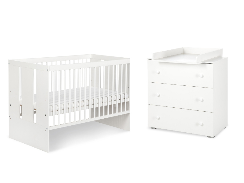 Componentele mobilierului pentru copii si bebelusi Klups Paula Albnbsp-Patut Paula Alb 120(L) x 60(l) cm-Comoda de infasatnbspPaula Albnbsp80(L) x 48(l) x 81(h) cm-Saltea copii MyKids Cocos Confort 12
