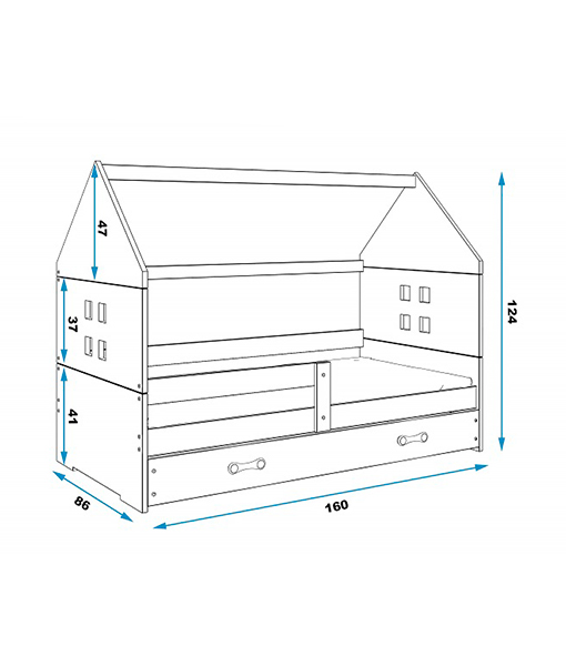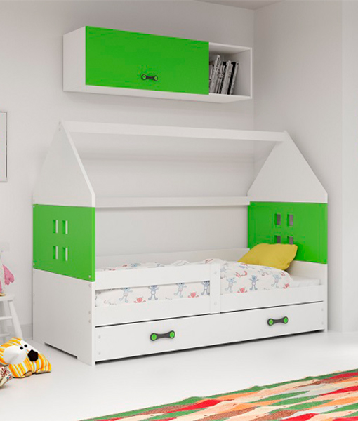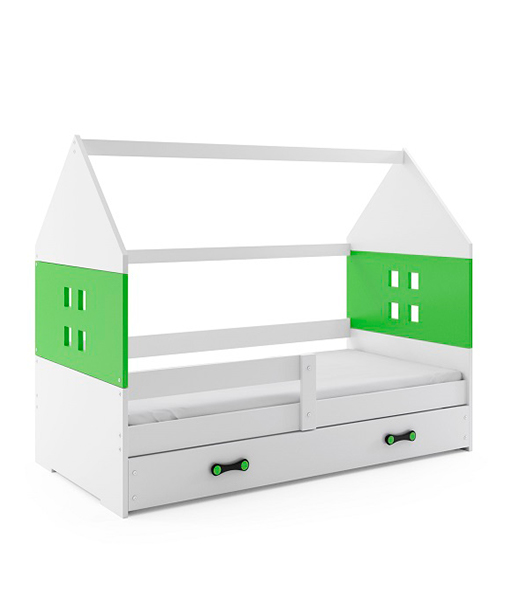 Pat copii montessori casuta Domy alb-vernilRama este realizata din lemn de pin nordic, cu margini rotunjie.Toate componentele sunt vopsitelacuite in 3 straturi, cu vopseluri speciale fara miros si pe
