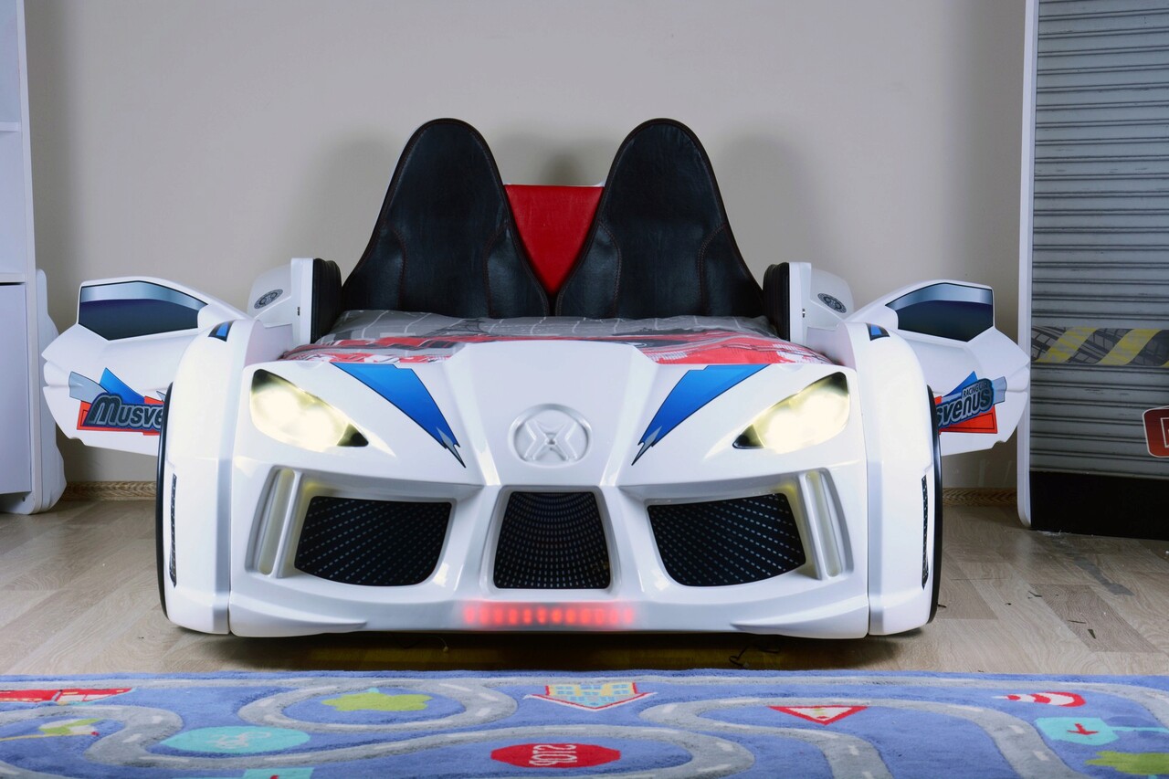 <p>Corp: PAL (Grosime: 18 mm)<br/><br/>Partea exterioara: ABS<br/><br/>Tapiterie: 100% PIELE<br/><br/>Invelis din acril<br/><br/>14 lamele din lemn pentru cadru de pat<br/><br/>Latime: 130 cm <br/> Inaltime: 60 cm <br/> Adancime: 235 cm<br/><br/><br/><br/>Zgomot mașină de 4 tipuri acționate de la distanță<br/><br/>Faruri LED de lucru<br/></p>