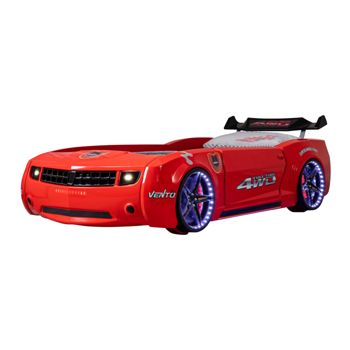 Pat pentru copii masina CAMARO, cu leduri, rosu, 90×190 cm