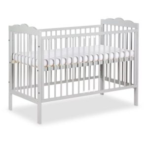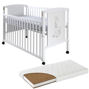 Patut din lemn masiv 120×60 cm Orella alb cu laterala culisanta si roti cu saltea de 12 cm