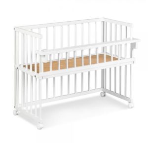 Patut co-sleeping 120×60 cu laterala culisanta total si roti Treppy Dreamy Plus, integral din lemn masiv fag, reglabil pe 5 nivele, include sistem de ancorare, certificat TUV, EN716-1, EN716-2, culoare alb + saltea cocos 12 cm