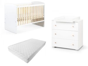 Patut din lemn masiv 2 in 1 Maya alb cu sertar si saltea 12 cm