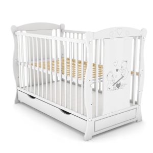 Patut din lemn masiv 120×60 cm Isla alb cu sertar si roti cu saltea de 12 cm