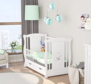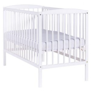 Patut din lemn masiv 120×60 cm Bria alb cu laterala culisanta si roti cu saltea de 12 cm