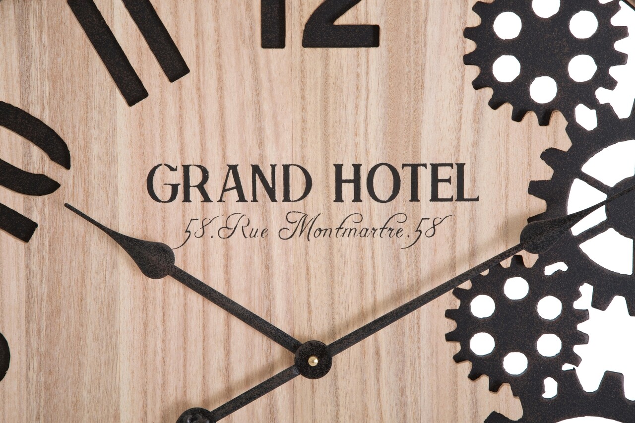 <p>Ceas de perete rotund cu angrenaje care amintesc de mecanismele interne ale dispozitivelor mecanice. <br />Compozitie material: fier, MDF</p>