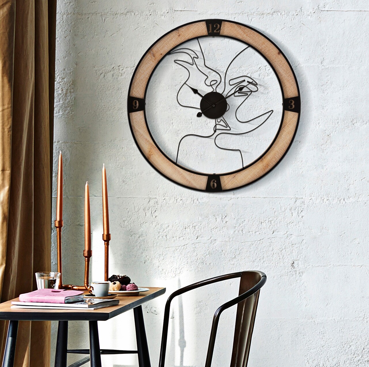 <p>Ceas rotund de perete cu insertii din lemn si cadran impodobit cu doua fete stilizate.<br /><br />Compozitie material: fier, lemn.</p> <p>Functioneaza cu baterie AA (aceasta nu este inclusa!).</p>