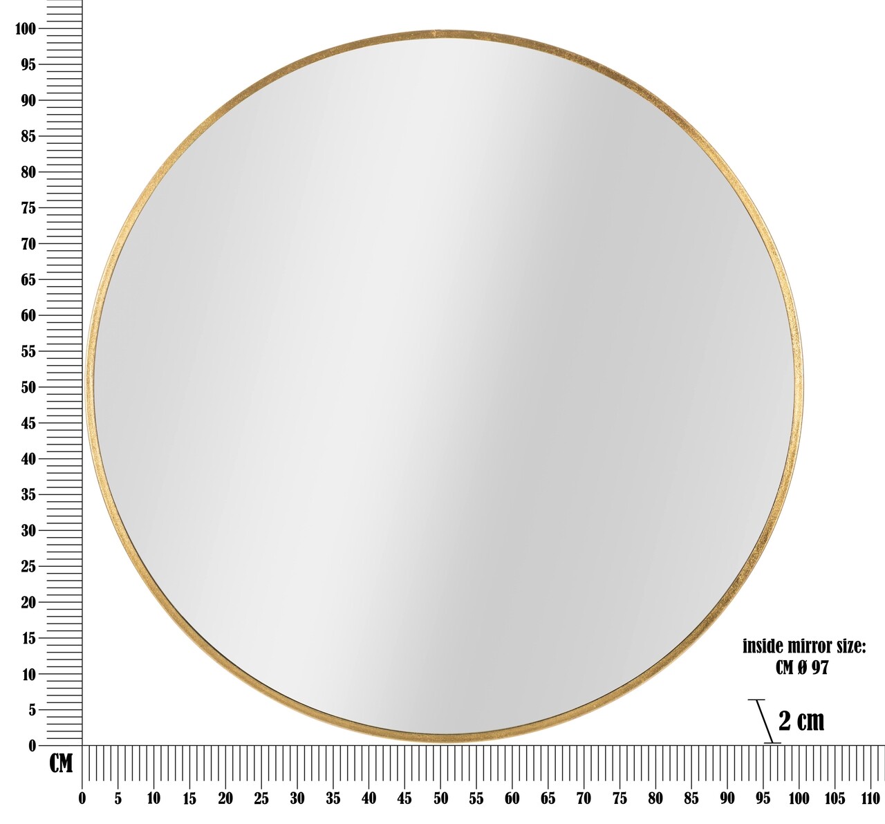 <p>Oglinda rotunda de perete cu rama aurie. Liniile minimaliste si esentiale dau o nota de clasa oricarei incaperi. <br /><strong>Caracteristici:</strong><br />Dimensiuni suprafata de oglindire: Ø 97 cm<br />Compozitie material: fier, oglinda, MDF</p>