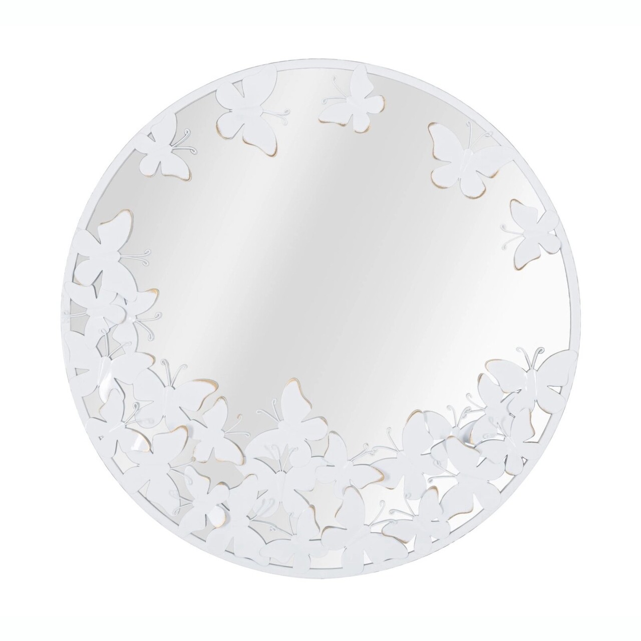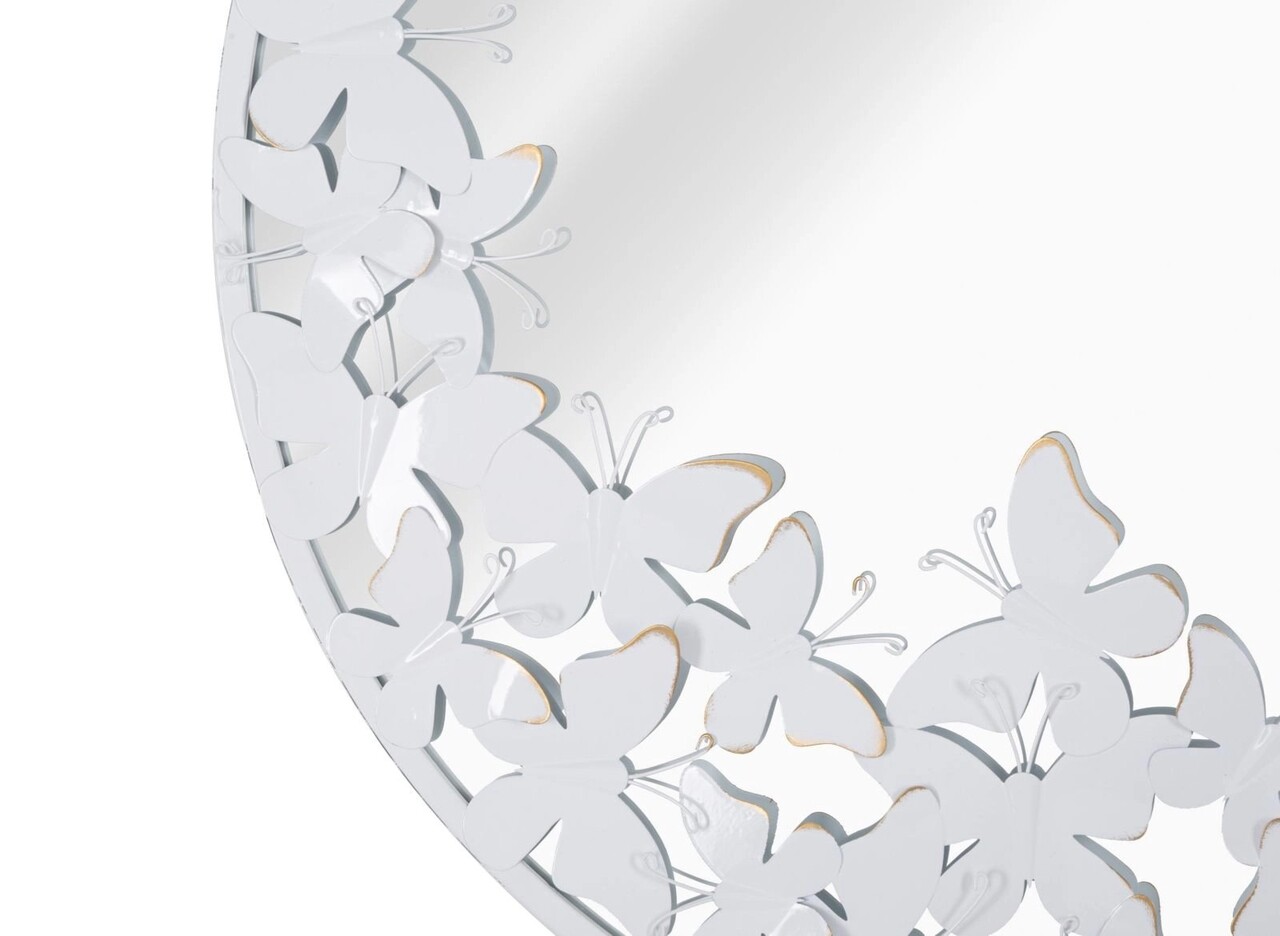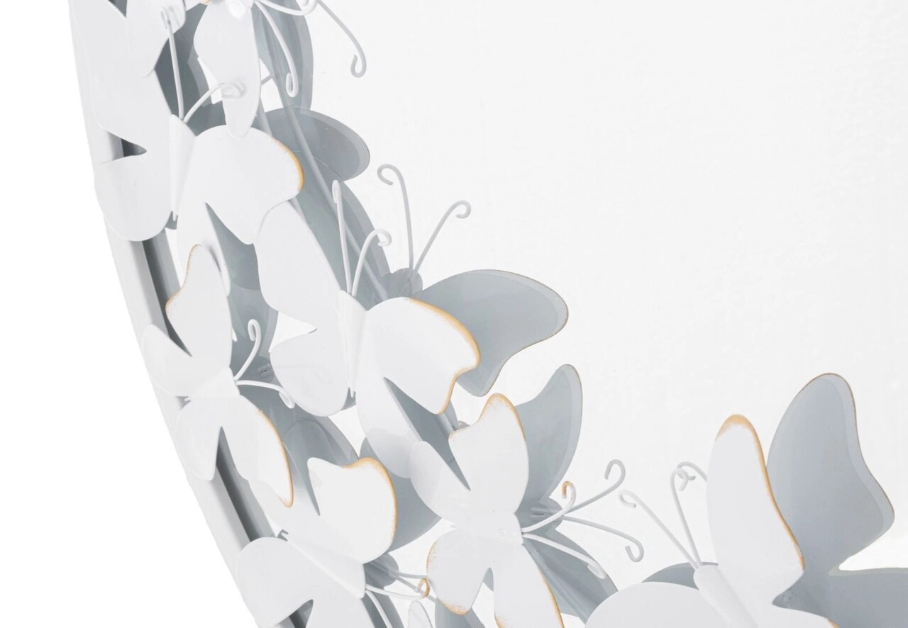 <p>Oglinda rotunda din metal alb, cu fluturi decorativi eleganti, cu profile aurii. Oglinzile sunt un element esential pentru a da luminozitate unei ambiante glamour. ele largesc optic spatiile si creeaza un punct de lumina fin. <br /><strong>Caracteristici:</strong><br />Dimensiuni suprafata de oglindire: 60×45 cm<br />Compozitie material: fier, oglinda, MDF</p>