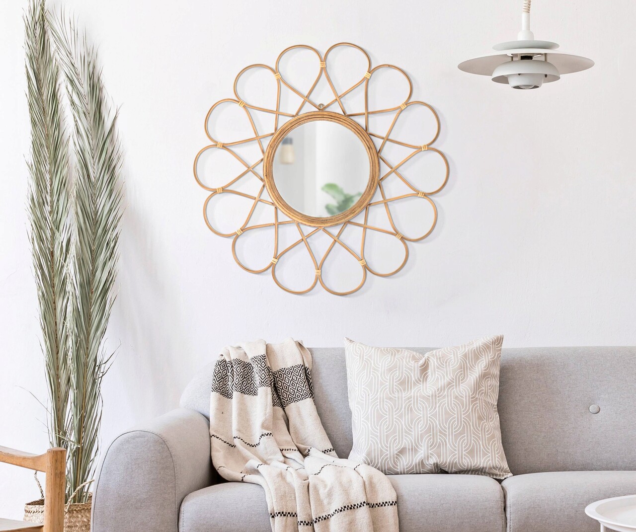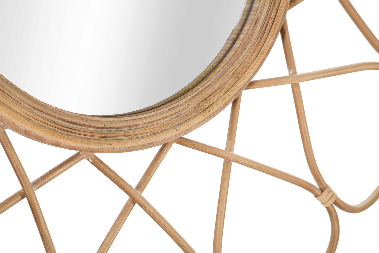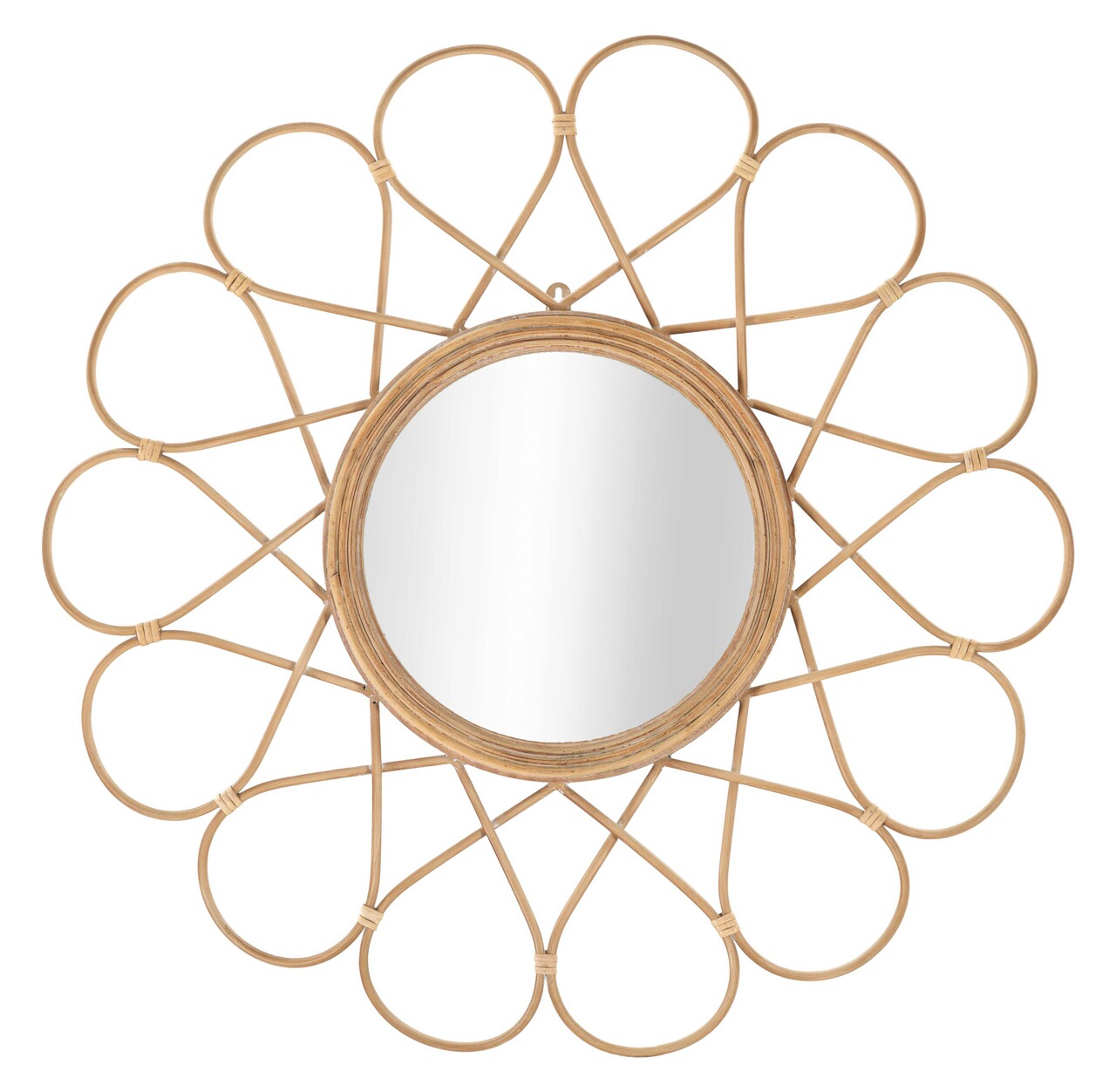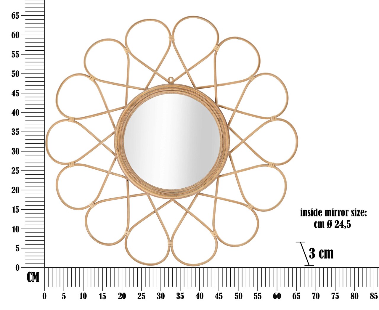 <p>Oglinda rotunda de perete cu finisaj din ratan, design rotunjit si linii fluide care amintesc de petalele unei flori.<br /><strong>Mentiuni</strong><br />Dimensiuni oglinda: 24.5 cm.<br />Compozitie material: fier, ratan, oglinda.</p>